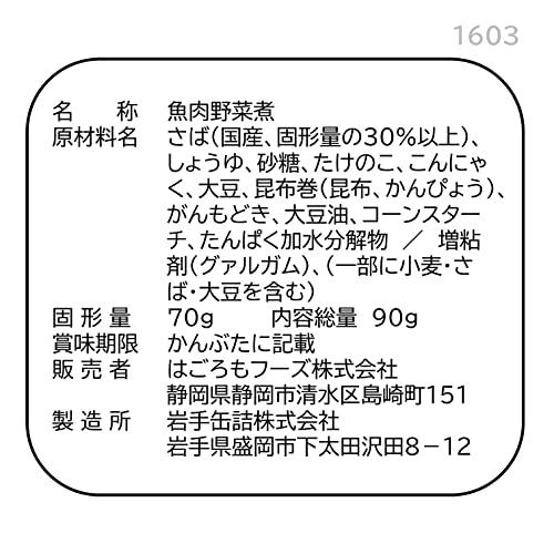 さば、たけのこ、こんにゃく、大豆、こんぶ巻、京がんもを煮こみました。お弁当に適したおかずです。内容総量90g固形量70gエネルギー(kcal)1缶当り:液汁含む136kcalアレルギー物質:さば(さば)、大豆(大豆)、がんもどき(大豆)、大豆油(大豆)、たんぱく加水分解物(大豆)、しょうゆ(小麦・大豆)
