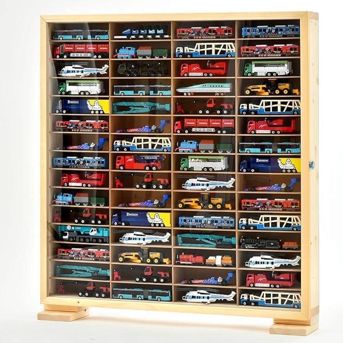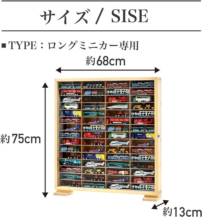 ■商品説明【120台収納可能なロングミニカーのコレクションケース】 ピンフックに金物を掛けるだけ。ミニカーを最大96台収納可能なコレクションケース。トミカの場合、箱を後ろミニカーを前に収納、1マスにミニカーを2台収納することも可能です!。誕生日やクリスマス、お祝いに子供から大人まで楽しめるプレゼントとして最適です!雑誌「リンネル」掲載 2022年12月20日 【お子様が使うケースだから】お子様が怪我をしないように商品の面(角)は削っております。扉ありのタイプは扉にも安全性が高い塩ビ板を使用しております。※扉に衝撃が加わると塩ビ板が外れる可能性がございますが、外れても直せるようになっています。 【お手入れもカンタンなコレクション】仕切りは全て取り外しができるので、取り出し、収納、お掃除・お手入れもカンタン。キレイに並ぶことで、ひとつずつ宝物を集める楽しみが増えます。仕切りを外して枠の大きさを変える事で、ミニチュアやフィギュアなど他の収納にもお使い頂けます。 【点一点こころを込める制作】職人が一商品一商品心を込めて制作しております。箱と中身が前後で収納できるから、箱だけ失くしたり、ばらばらになる心配もなし。仕切りを外して枠の大きさを変える事で、ミニチュアやフィギュアなど他の収納にもお使い頂けます。 【商品詳細】サイズ: (1マスの大きさ) 高さ約4.2cm×幅約15.8cm×奥行約8cm (全長)高さ約75cm×幅約68cm×奥行き約13cm / 重量:約6.2kg