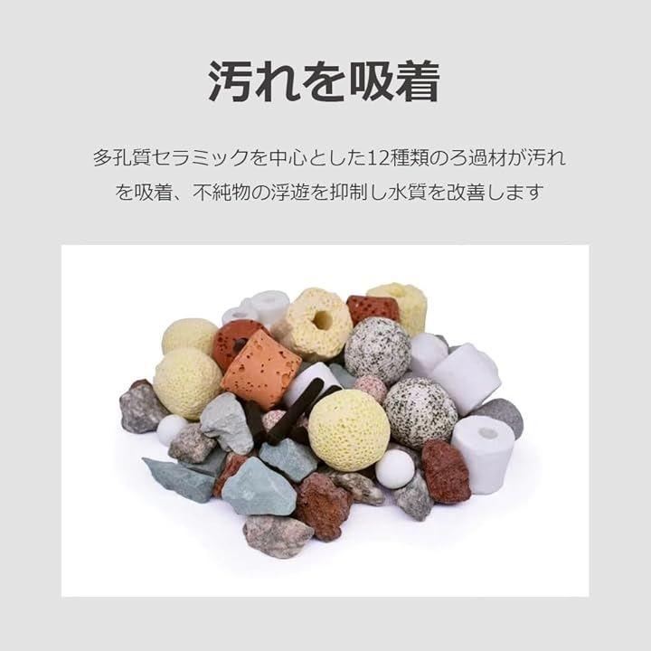 「吸着+分解のW作用」多孔質セラミックを中心とした12種類のろ過材が汚れを吸着、不純物の浮遊を抑制するとともに、水質改善に大きな役割を果たすバクテリアが定着しやすい仕様。
