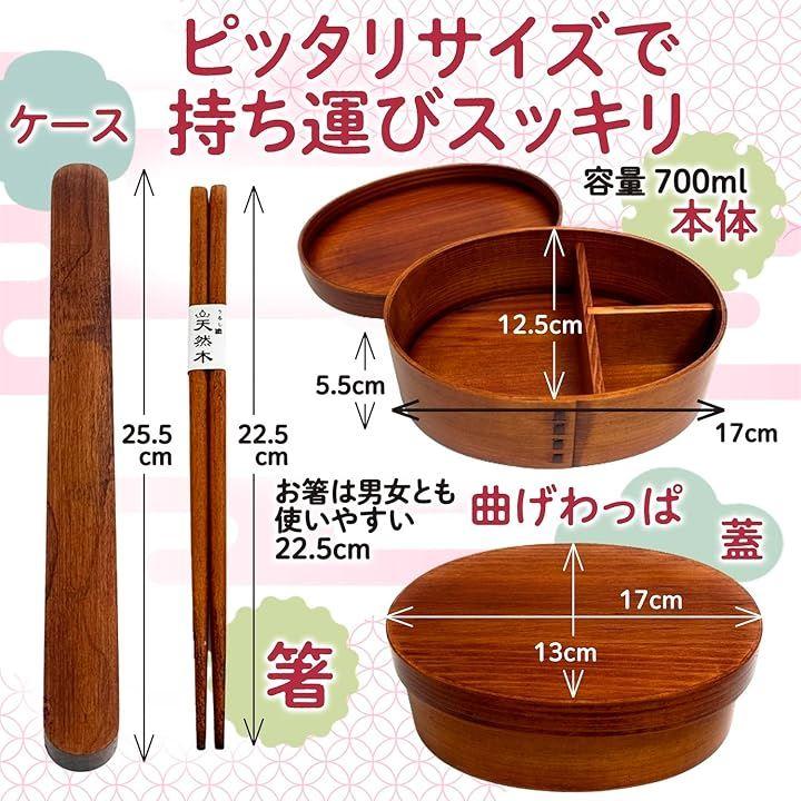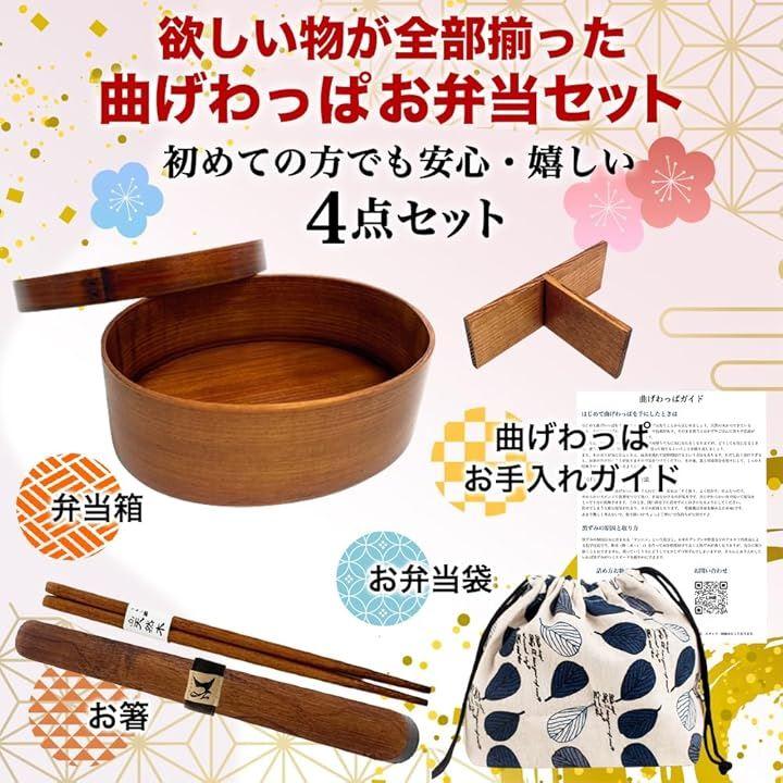 「初心者にお勧め。買い足し不要の4点セット。」「白木調まげわっぱ」「箱付き箸・スプーン・フォーク」「巾着」「お手入れガイドブック」の豪華4点セット。買い足し不要ですぐに曲げわっぱデビュー。