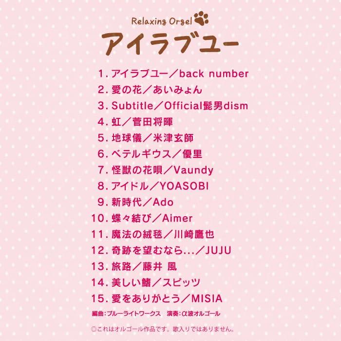 NHK朝ドラの主題歌にもなったback number「アイラブユー」、あいみょん「愛の花」をはじめ、話題のジブリ映画『君たちはどう生きるか』より主題歌「地球儀」、その他、YOASOBI「アイドル」、MISIA「愛をありがとう」など、幅広い世代にお馴染みのメロディーを全15曲、α波のゆらぎ信号を合わせたリラックス効果抜群のオルゴールサウンドでお届けします。