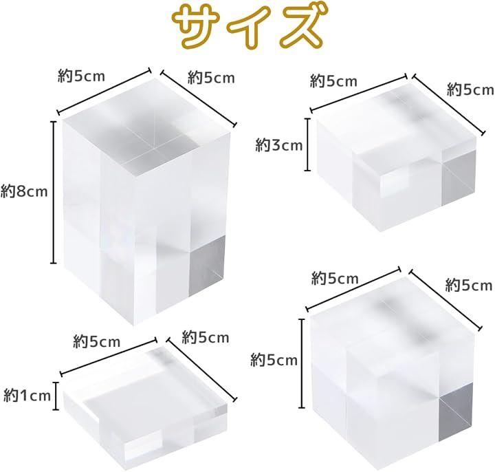 サイズバリエーション(5 x 5 x 8cm、5 x 5 x 3cm、5 x 5 x 1cm、5 x 5 x 5cm)が異なるため、アイテムの大きさやディスプレイスペースに合わせて使い分けが可能です。