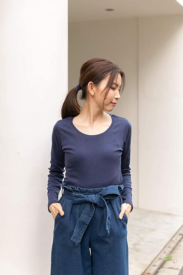 ・クルーネックでスタイリッシュな印象のロングスリーブトップスは無地だから流行りすたりなく、どんなアイテムとも合わせやすいので色違いで欲しくなっちゃう・