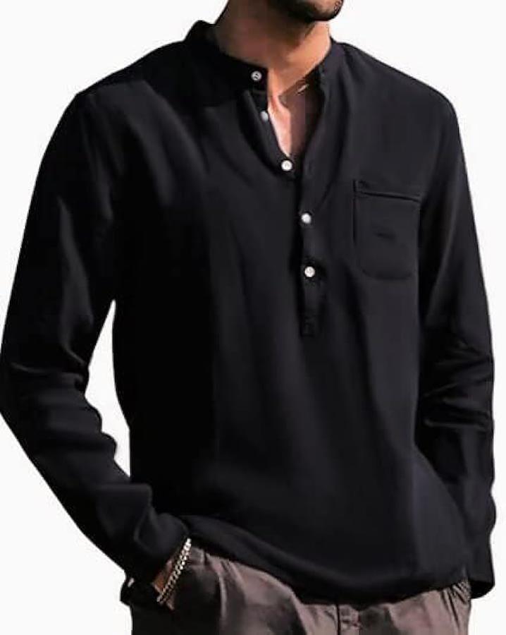 *周りと差をつけた着こなしが楽しめるヘンリーネックシャツ。
