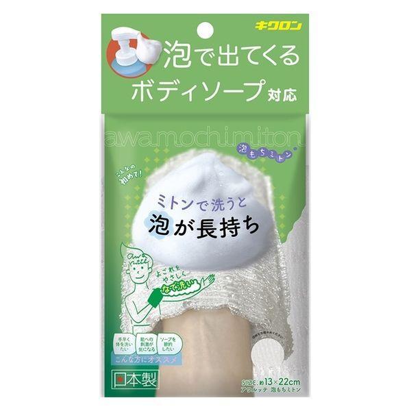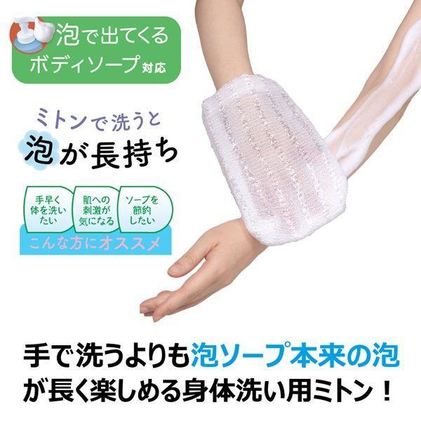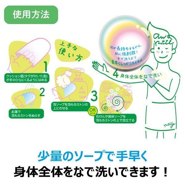 【上手な使い方】(1)クッション面(タグが付いた面)が手のひらにくるようにはめる。(2)お湯で泡もちミトンをぬらす。(3)泡ソープを泡もちミトンの上にのせる。または、石けんや液体ソープを泡もちミトンの上で泡立てる。