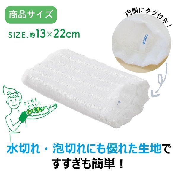 やさしい泡が長持ち!泡で出てくるボディソープ対応。●手で洗うよりもソープ本来の泡が長く楽しめる。※液体ソープ・石鹸でもご使用いただけます。●超極細繊維をたっぷり使用したやわらか生地。肌への摩擦が気になる方も、安心して洗えるやさしい肌ざわり。効率よくお肌の汚れを洗い流します。水切れ、泡切れにも優れた生地です。●生地に包み込まれたオリジナルクッション(抗菌・防カビ)。泡ソープの泡が手や生地に吸収されるのを防ぐことで泡を持続させます。波型にすることで生地にも空気を含み、泡もちをサポートします。※シート(中芯)に無機系抗菌剤・防カビ剤を練り込んでいます。※抗菌・防カビとは、商品に直接付着した細菌の増殖・かびの発育を抑えるもので、使用状況により効果が持続しにくい場合があります。●こんな方にオススメ。・手早く体を洗いたい。・肌への刺激が気になる。・ソープを節約したい。