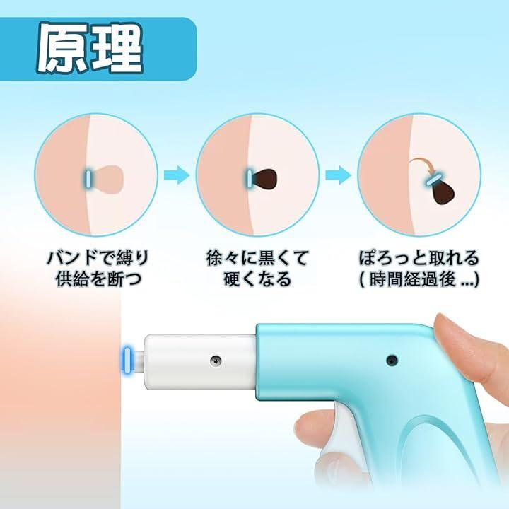 この除去ツールは、ゴムバンドの使用によって突起物の供給を停止し、突起物が枯れてゆく、3-14日以内に脱落するまで。