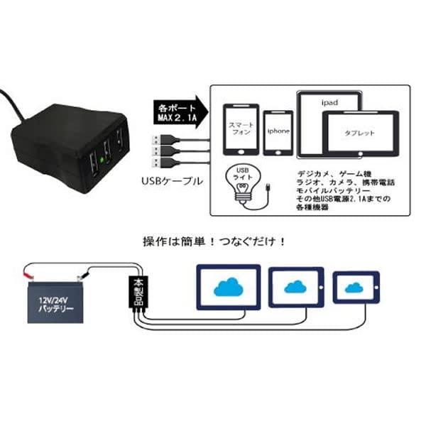 入力電圧:DC12V-24VUSB出力電圧:5VUSB出力電流:2100mA質量:約69g材質:PC-ABS樹脂