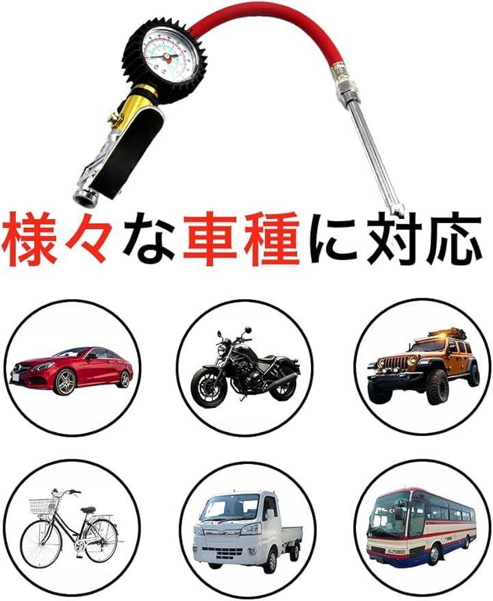 「3つの優れた機能」自動車・バイク・トラックなどのタイヤの空気を入れたあとのタイヤの空気圧チェックが確認できます。