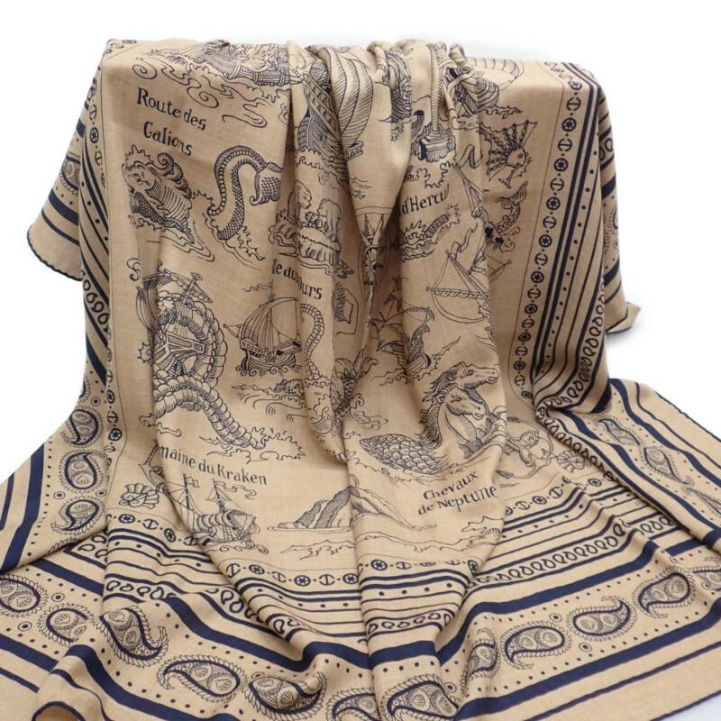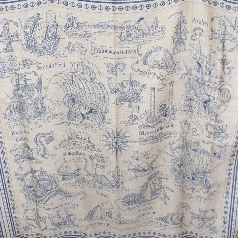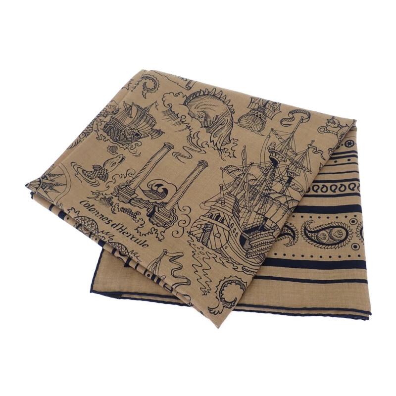 「船乗りのタトゥー」をモチーフとし、躍動感あふれるデザインがナチュラルな配色に映える大判スカーフです。