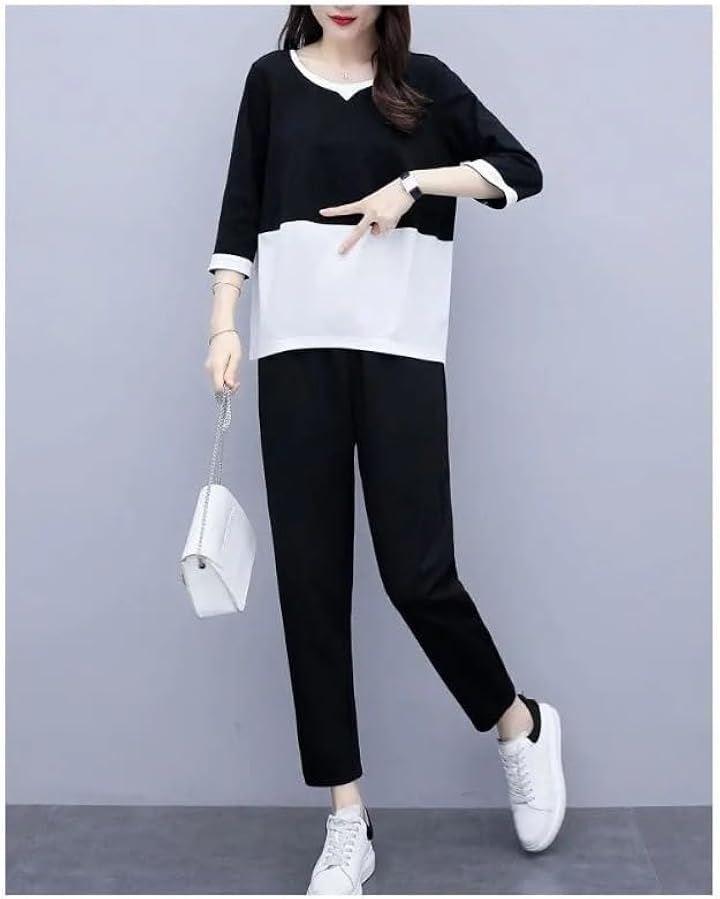半袖のクルーネックトップスとアンクル丈のボトムスの2点セットです。