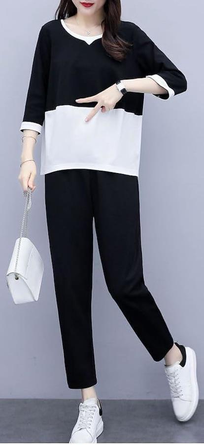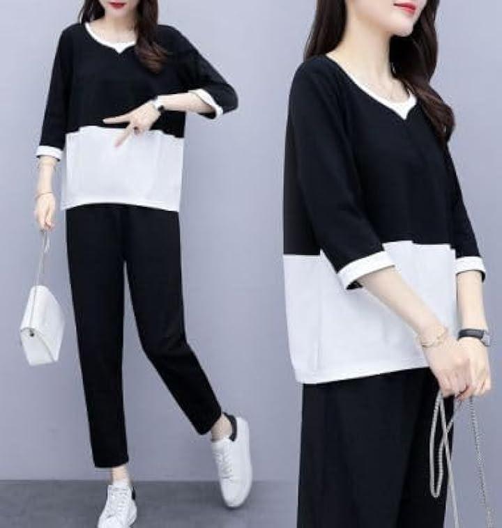 半袖のクルーネックトップスとアンクル丈のパンツの上下2点セットです。