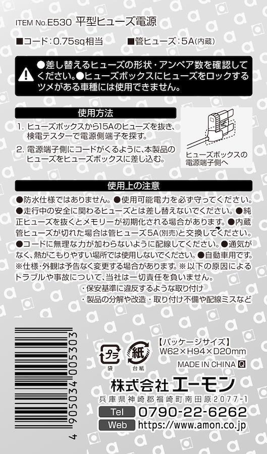 エーモン 平型ヒューズ電源 DC12V・60W/DC24V・120W 15Aヒューズ差替用 E530サイズ: 15A【仕様】15Aヒューズ交換用コードサイズ:AVSS0.75sq使用可能電力:DC12V・60W以下/DC24V・120W以下管ヒューズ(5A)付商品紹介■ポータブルナビ・レーダー探知機・ドライブレコーダーなどの電源取り出しに■ヒューズボックスの平型ヒューズと差しかえるだけで電源が簡単に取り出せる使用上の注意製品の仕様は予告なく変更する場合がございます。