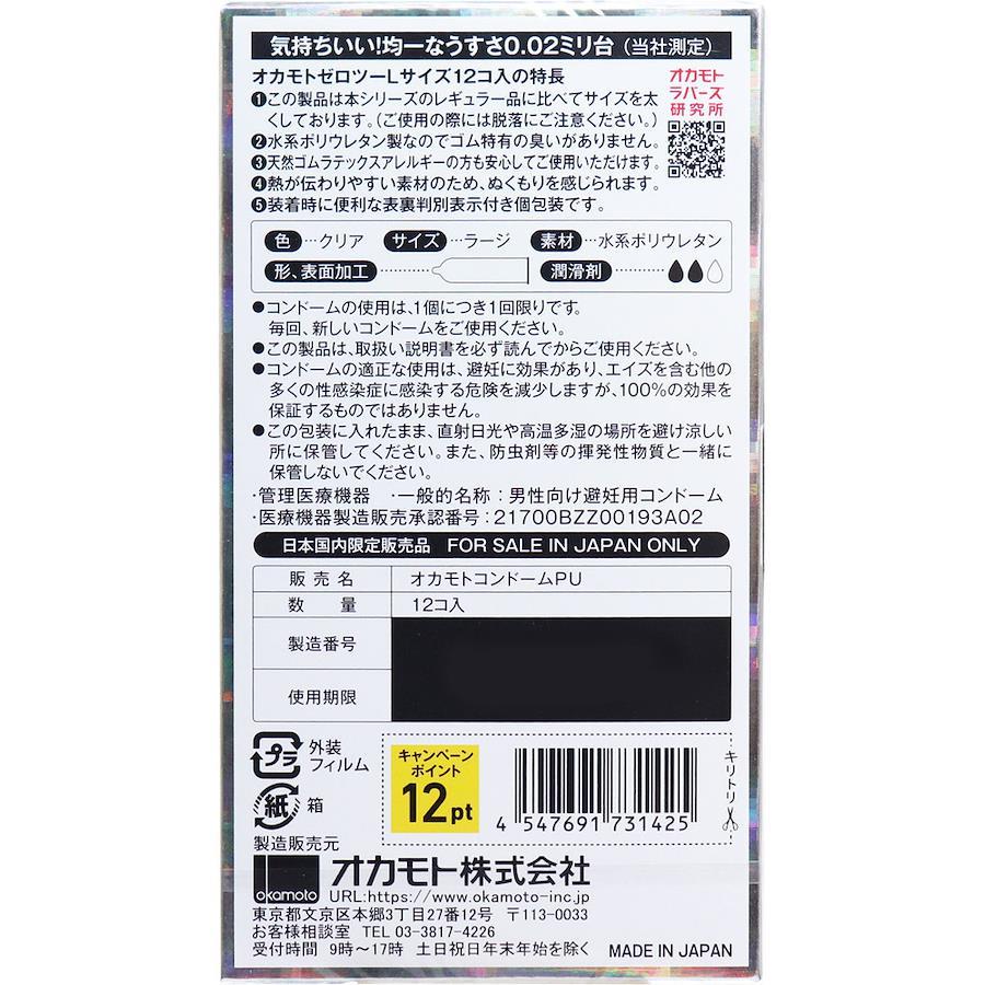 激うす体験!0.02ミリ!●水系ポリウレタン製なのでゴム特有の臭いがありません。●天然ゴムラテックスやアレルギーの方も安心してご使用いただけます。●熱が伝わりやすい素材のため、ぬくもりを感じられます。●装着時に便利な表裏判別表示付き個包装です。●この製品は本シリーズのレギュラー品に比べてサイズを太くしております。(ご使用の際には脱落にご注意ください。)