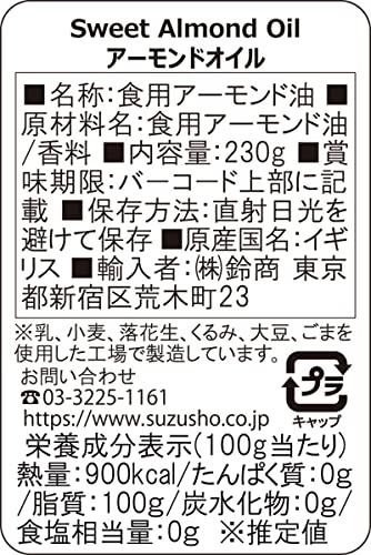 内容量:230gカロリー:100g当たり 928Kcal原材料:食用アーモンド油、香料商品サイズ(幅×奥行×高さ):58×48×179mm【重要】メーカーによる商品リニューアルに伴いパッケージ(内容量も含む)変更が行われた場合、新パッケージでお届け致します事ご了承願います。
