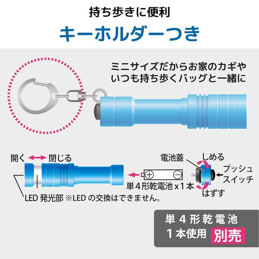 ●保護等級IP66の防水仕様 ●キーホルダー付き ●ランタン機能付き…先端部をスライドさせて開くと、全周明るく照らします ●FL-1 STANDARD(アメリカ可搬型照明器具標準基準ANSI/NEMA FL1-2009)準拠【 特 長 】● 保護等級IP66の防水仕様● キーホルダー付き● ランタン機能付き先端部をスライドさせて開くと、全周明るく照らします● FL-1 STANDARD(アメリカ可搬型照明器具標準基準 ANSI/NEMA FL1-2009)準拠● 本体カラー ブルー【 仕 様 】■ 電源:単4形乾電池1本(別売)■ 光源:白色系LED1個(LED交換不可)■ 最大消費電流:約134mA■ 連続使用時間(未使用・新品のアルカリ乾電池使用時):明るさ10%まで約11.5時間■ 光束:約18 lm(ルーメン)■ 照射距離:約26m■ 保護等級:IP66 じんあいの侵入があってはならない。暴噴流に対して保護する。あらゆる方向からのノズルによる強力なジェット噴流水によっても有害な影響を及ぼしてはならない。(JIS C 0920:2003による)■ 本体質量:約23g(キーホルダー、電池別)■ 外形寸法:(約)外径19×全長84.5mm(キーホルダー除く)■ 付属品:キーホルダー