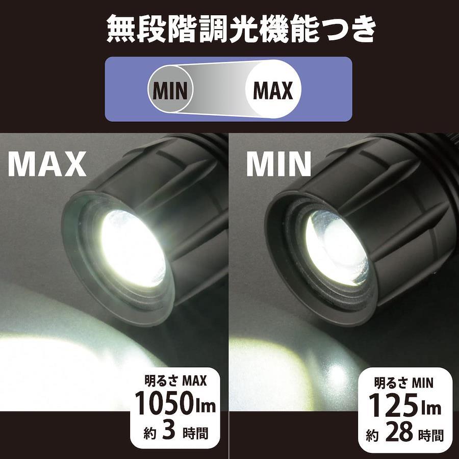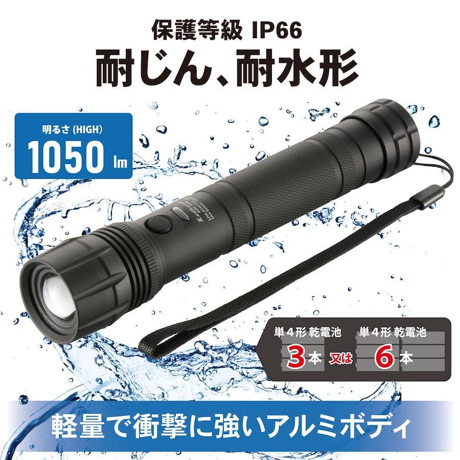 【 仕 様 】■ 電源:単4形乾電池6本 又は 3本(別売)■ 光源:白色系LED1個(LED交換不可)■ 連続使用時間:※未使用・新品のアルカリ乾電池使用時・ 単4形乾電池6本の場合明るさ10%まで…約3時間/明るさMAX、約28時間/明るさMIN明るさ5 lmまで…約8.5時間/明るさMAX、約39時間/明るさMIN・ 単4形乾電池3本の場合明るさ10%まで…約1時間/明るさMAX、約17時間/明るさMIN明るさ5 lmまで…約3時間/明るさMAX、約20時間/明るさMIN■ 光束:約1050 lm(単4形乾電池6本の場合)、約660 lm(単4形乾電池3本の場合)■ 照射距離:約239m■ 保護等級:IP66(耐じん・耐水形:じんあいの侵入があってはならない。暴噴流に対して保護する。あらゆる方向からのノズルによる強力なジェッ卜噴流水によっても有害な影響を及ぼしてはならない。)※JIS C 0920:2003による■ 本体質量:約212g(電池別)■ 外形寸法:(約)直径40×長さ204mm■ 付属品:ストラップ【 特 長 】 ◆スライドフォーカス機能付き ◆無段階調光機能、点滅機能付き ◆高速/低速と点滅間隔が調整できるアジャストフラッシュモード付き ◆保護等級IP66の耐じん耐水形で本体丸洗いOK ◆単4形乾電池3本または単4形乾電池6本のどちらでも点灯 ◆電池残量インジケーター付き ◆アルミボディ ◆携帯ストラップ付き ◆長時間明るさを維持するTIMAX ICを搭載(TiMAX um-2 Super LED Driver:特許第6429128号) ◆FL1 STANDARD(アメリカ ANSI/NEMA FL1-2009規格)準拠【 仕 様 】 ◆電源:単4形乾電池6本 又は 3本(別売) ◆光源:白色系LED1個(LED交換不可) ◆連続使用時間:※未使用・新品のアルカリ乾電池使用時・ 単4形乾電池6本の場合 明るさ10%まで…約3時間/明るさMAX、約28時間/明るさMIN 明るさ5 lmまで…約8.5時間/明るさMAX、約39時間/明るさMIN・ 単4形乾電池3本の場合 明るさ10%まで…約1時間/明るさMAX、約17時間/明るさMIN 明るさ5 lmまで…約3時間/明るさMAX、約20時間/明るさMIN◆光束:約1050 lm(単4形乾電池6本の場合)、約660 lm(単4形乾電池3本の場合) ◆照射距離:約239m ◆保護等級:IP66(耐じん・耐水形:じんあいの侵入があってはならない。暴噴流に対して保護する。あらゆる方向からのノズルによる強力なジェッ卜噴流水によっても有害な影響を及ぼしてはならない。)※JIS C 0920:2003による ◆本体質量:約212g(電池別) ◆外形寸法:(約)直径40×長さ204mm ◆付属品:ストラップ
