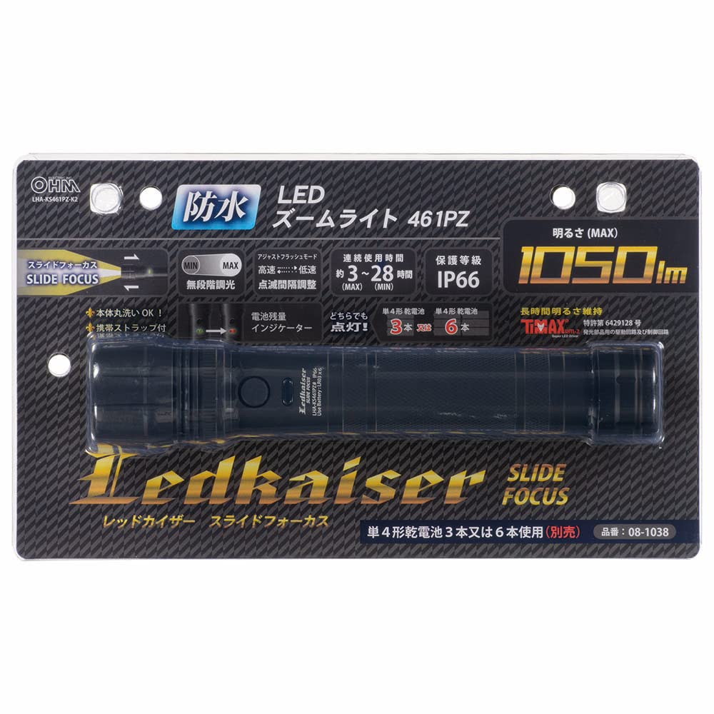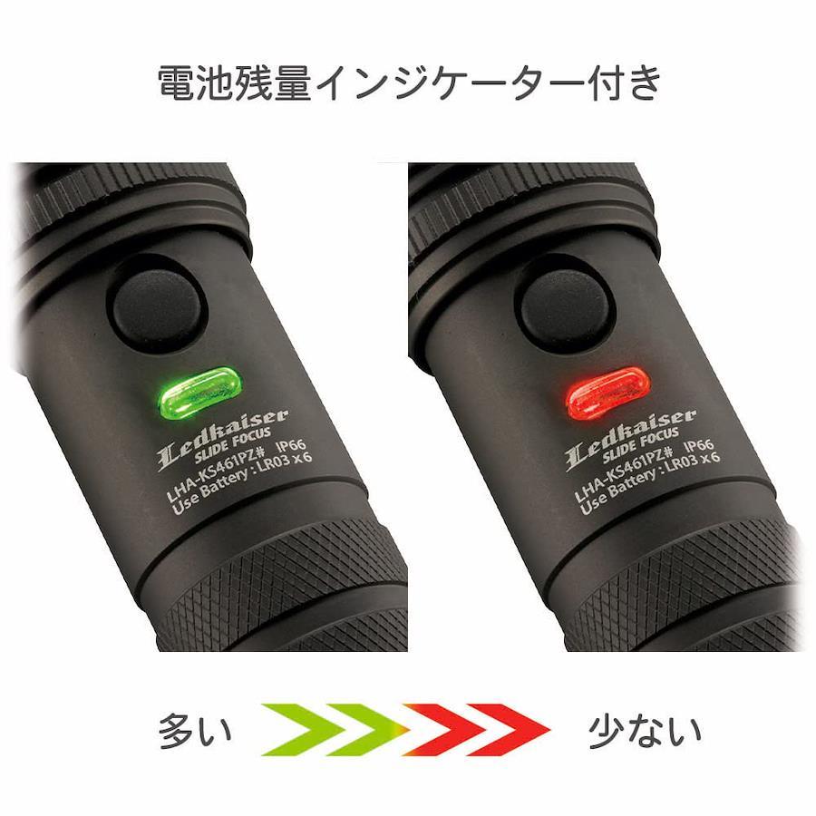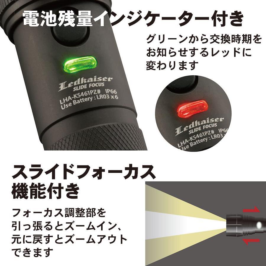 【 特 長 】● スライドフォーカス機能付き● 無段階調光機能、点滅機能付き● 高速/低速と点滅間隔が調整できるアジャストフラッシュモード付き● 保護等級IP66の耐じん耐水形で本体丸洗いOK● 単4形乾電池3本または単4形乾電池6本のどちらでも点灯● 電池残量インジケーター付き● アルミボディ● 携帯ストラップ付き● 長時間明るさを維持するTIMAX ICを搭載(TiMAX um-2 Super LED Driver:特許第6429128号)● FL1 STANDARD(アメリカ ANSI/NEMA FL1-2009規格)準拠
