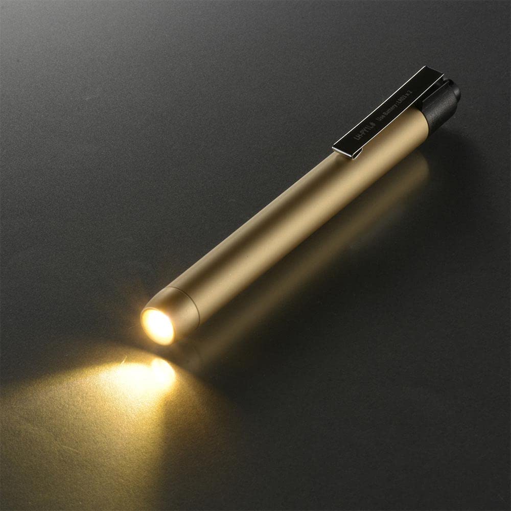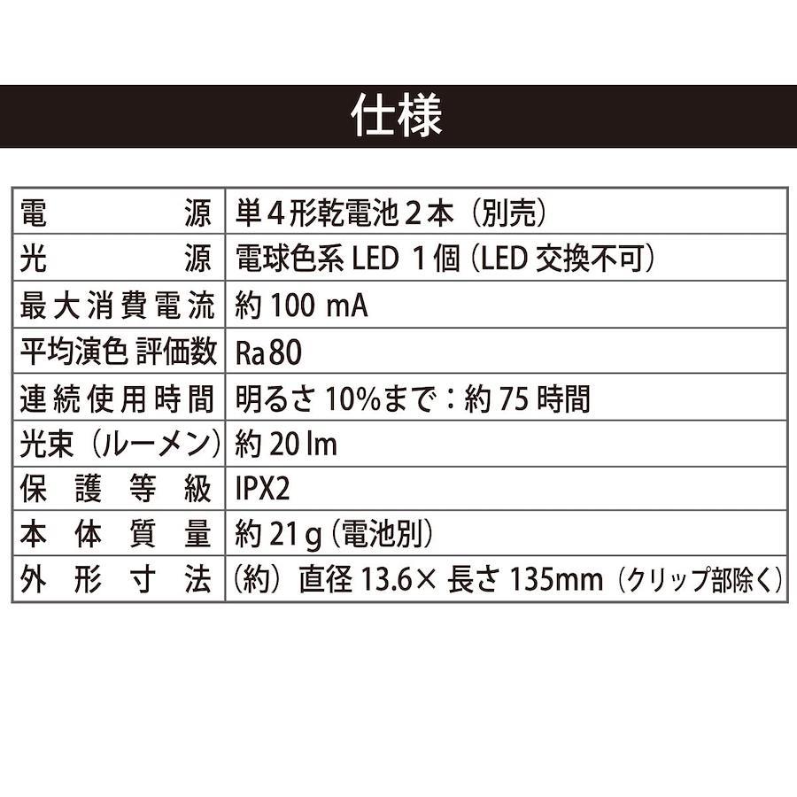 ●軽量で衝撃に強いアルミボディ ●点灯色は電球色 ●携帯用クリップ付 ●本体カラーはゴールド【 特 長 】 ◆軽量で衝撃に強いアルミボディ ◆点灯色は電球色 ◆携帯用クリップ付 ◆本体カラーはゴールド【 仕 様 】 ◆電源:単4形乾電池×2本(別売) ◆光源:電球色系LED×1個(LED交換不可) ◆最大消費電流:約100mA ◆平均演色評価数:Ra80 ◆連続使用時間:(明るさ10 Percentまで)約75時間 ※未使用・新品のアルカリ乾電池使用時 ◆光束(ルーメン):約20 lm◆保護等級:IPX2(防滴II形:15度以内で傾斜しても鉛直に落下する水滴に対して保護する。外郭が鉛直に対して両側に15度以内で傾斜したとき、鉛直に落下する水滴によっても有害な影響を及ぼしてはならない)※JIS C 0920:2003による◆本体質量:約21g(電池別) ◆外径寸法(約):直径13.6×長さ135mm(クリップ部除く)