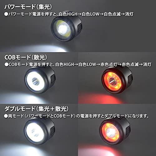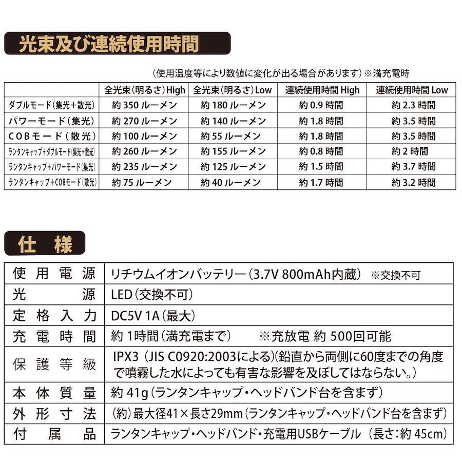 ●ランタンにもヘッドライトにもキャップライトにもなるマルチランタン ・ヘッドライト…ヘッドバンド台に付属のヘッドバンドを取り付けるとヘッドライトとして使えます(角度調節可能) ・ランタン…ランタンキャップを本体に取り付けるとランタンとして使えます ・キャップライト…ヘッドバンド台を開いてクリップに帽子などを挟むとキャップライトとして使えます(角度調節可能) ・マグネット…ヘッドバンド台を外して、金属類に取り付けると作業灯として使えます ●3つの点灯モード、明るさ調整機能 ・パワーモード(集光)…パワーモード電源を押すと、白色HIGH→白色LOW→白色点滅→消灯の順に切り替わります ・COBモード(散光)…COBモード電源を押すと、白色HIGH→白色LOW→赤色点灯→赤色点滅→消灯の順に切り替わります ・ダブルモード(集光+散光)…両モード(パワーモードとCOBモード)の電源を押すとダブルモードになり、より明るくなります ●USB充電式(専用USBケーブル付属) ●ヘッドバンド付属 ●連続点灯は約2.3時間 ※ダブルモードLow時 ●全光束は350ルーメン、照度は約3100ルクス ※※ダブルモードHigh時【 特 長 】 ◆ランタンにもヘッドライトにもキャップライトにもなるマルチランタン・ ヘッドライト…ヘッドバンド台に付属のヘッドバンドを取り付けるとヘッドライトとして使えます(角度調節可能)・ ランタン…ランタンキャップを本体に取り付けるとランタンとして使えます・ キャップライト…ヘッドバンド台を開いてクリップに帽子などを挟むとキャップライトとして使えます(角度調節可能)・ マグネット…ヘッドバンド台を外して、金属類に取り付けると作業灯として使えます◆3つの点灯モード、明るさ調整機能・ パワーモード(集光)…パワーモード電源を押すと、白色HIGH→白色LOW→白色点滅→消灯の順に切り替わります・ COBモード(散光)…COBモード電源を押すと、白色HIGH→白色LOW→赤色点灯→赤色点滅→消灯の順に切り替わります・ ダブルモード(集光+散光)…両モード(パワーモードとCOBモード)の電源を押すとダブルモードになり、より明るくなります ◆USB充電式(専用USBケーブル付属) ◆ヘッドバンド付属 ◆連続点灯は約2.3時間 ※ダブルモードLow時 ◆全光束は350ルーメン 、照度は約3100ルクス ※ダブルモードHigh時【 仕 様 】 ◆使用電源:リチウムイオンバッテリー(3.7V 800mAh内蔵)※交換不可 ◆光源:LED(交換不可) ◆定格入力:DC5V 1A(最大) ◆充電時間:約1時間(満充電まで) ※充放電 約500回可能 ◆保護等級:IPX3(防雨型)…鉛直から両側に60度までの角度で噴霧した水によっても有害な影響を及ぼしてはならない ※JIS C 0920:2003による ◆本体質量:約41g(ランタンキャップ・ヘッドバンド台を含まず) ◆外形寸法:(約)最大径41×長さ29mm(ランタンキャップ・ヘッドバンド台を含まず) ◆付属品:ランタンキャップ・ヘッドバンド・充電用USBケーブル(長さ…約45cm)