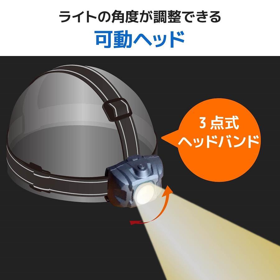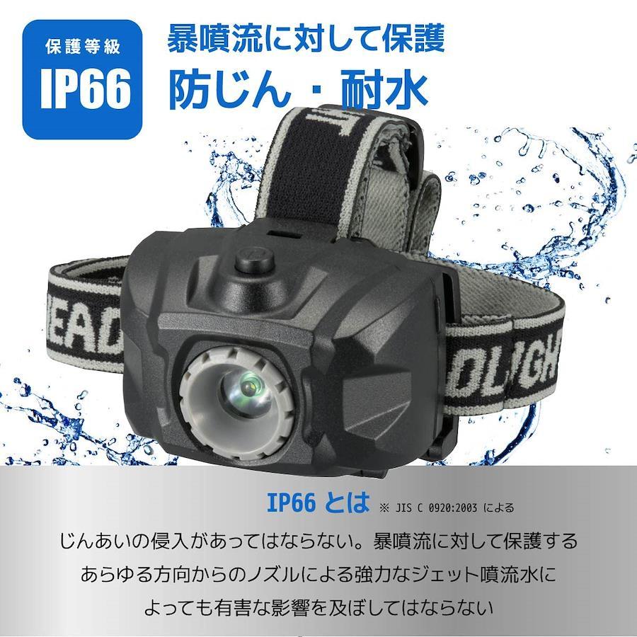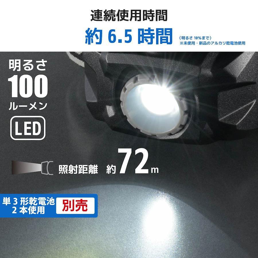 ●可動ヘッドでライトの角度を調整できます ●3点式ヘッドバンド ●100ルーメン、1308カンデラの明るさ ●防水保護等級はIP66の耐じん、耐水形 ●FL1 STANDARD(アメリカ ANSI/NEMA FL1-2009規格)準拠【 特 長 】 ◆可動ヘッドでライトの角度を調整できます ◆3点式ヘッドバンド◆100ルーメン、1308カンデラの明るさ ◆防水保護等級はIP66の耐じん、耐水形 ◆FL1 STANDARD(アメリカ ANSI/NEMA FL1-2009規格)準拠【 仕 様 】 ◆電源:単3形乾電池2本(別売) ◆光源:白色系LED1個(LED交換不可) ◆連続使用時間:未使用・新品のアルカリ乾電池使用時 ・明るさ10%まで約6.5時間 ・明るさ5 lmまで約18時間◆光束:約100 lm(ルーメン) ◆照射距離:約72m ◆保護等級:IP66(耐じん・耐水形:じんあいの侵入があってはならない。暴噴流に対して保護する。あらゆる方向からのノズルによる強力なジェット噴流水によっても有害な影響を及ぼしてはならない。)※JIS C 0920:2003による ◆質量:約72g(電池別) ◆外形寸法:(約)幅67×高さ53.5×奥行46mm(ヘッドバンド除く) ◆付属品:ヘッドバンド