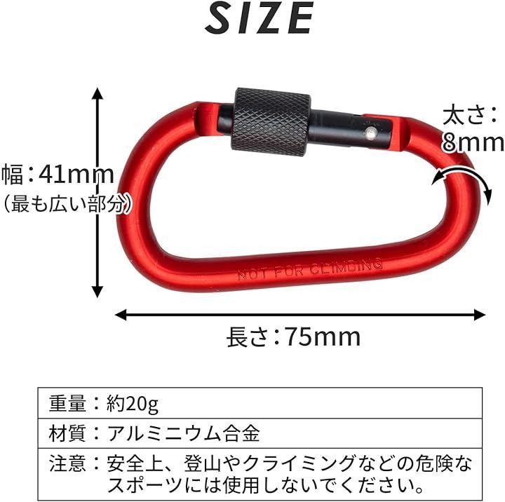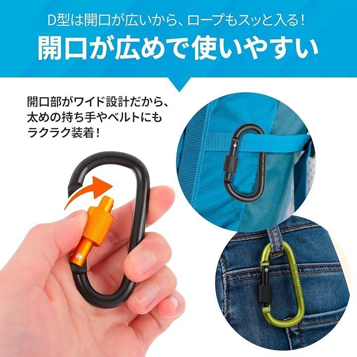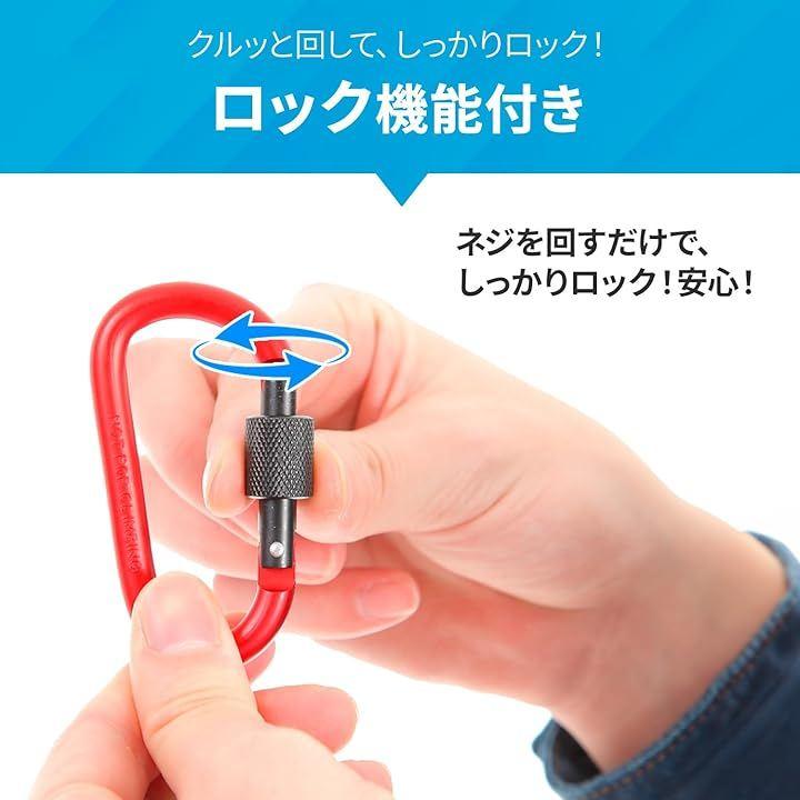 「落としたくないなら、スクリュー式が安心です」 スクリューをキュッと回すだけで、カラビナのゲートがしっかりロックされます。