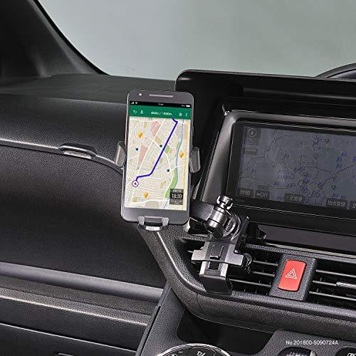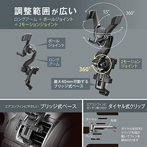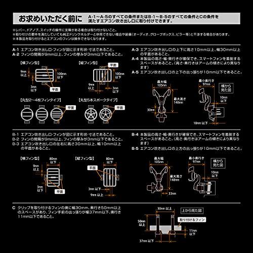スマートフォンの重さに連動して左右のウィングが連動して閉じる構造を採用、手間なく片手で簡単にホールドすることができます。スマートフォンを持ち出すときは、スマートフォンを持ち上げるだけでウィングが自動的に開き、簡単に取り出すことができます。ラバーの質感と高い耐久性を併せ持つエラストマー樹脂を採用しています。またスマートフォンを支える下部のフックには、緩衝性に優れるソフトクッションを採用、走行中でもカタ付かず、スマートフォンにキズをつけることもありません。ロングアーム+ボールジョイント+2モーションジョイントで、スマートフォンの位置調整が自由自在。レバー等の干渉を避けて、見やすい場所に位置することができます。締め付け式のエアコンクリップでエアコンフィンにしっかりと取り付けることができます。ベース部分はブリッジ式を採用、エアコン吹出し口のサイズに合わせて伸縮ができ、より多く大きさのエアコンに取り付けが可能です。ホールド可能なサイズと重さは幅:55~88mm/厚み:15mm以下/重さ:220g以下。様々なスマートフォンに対応します。ケースや落下防止リングを付けていても、ホール