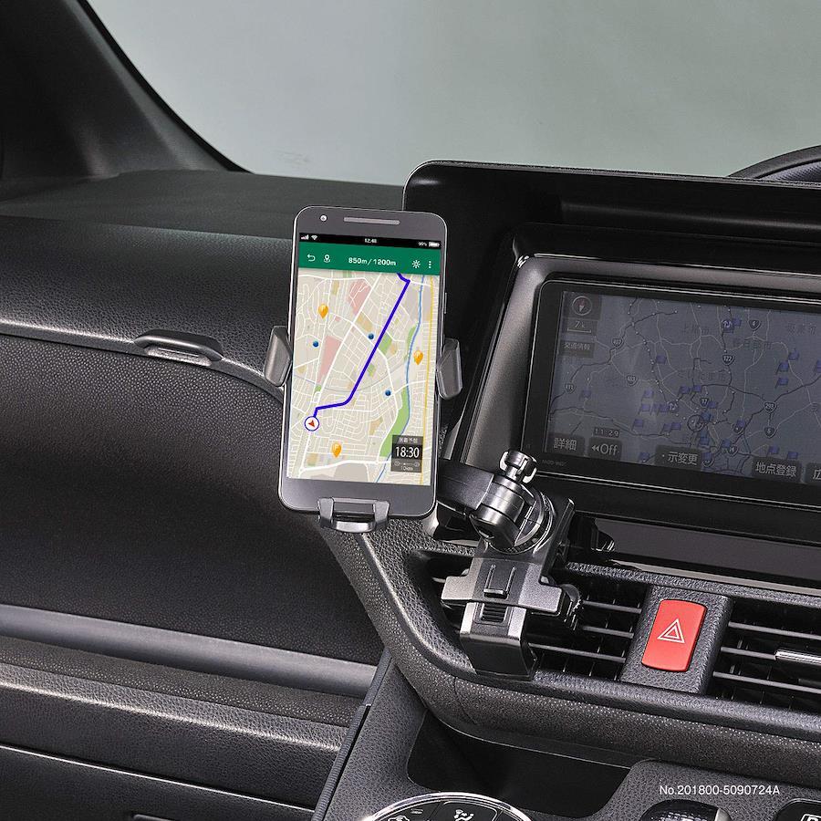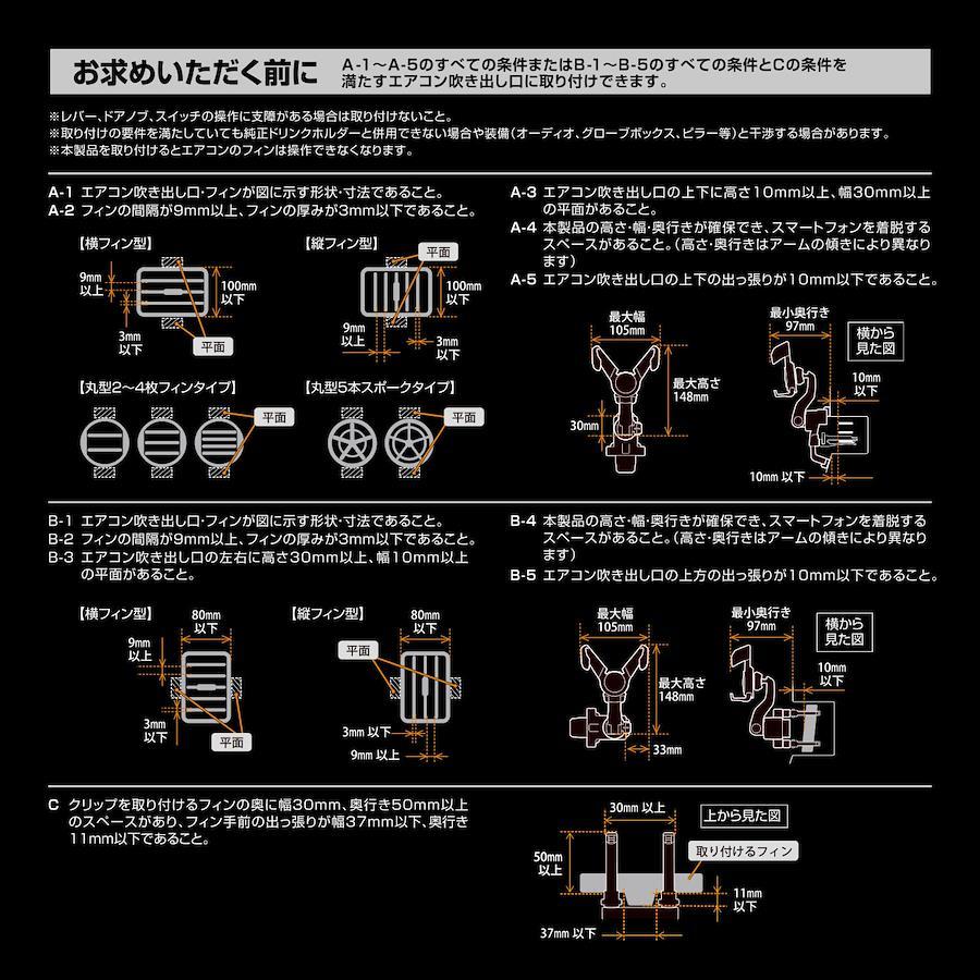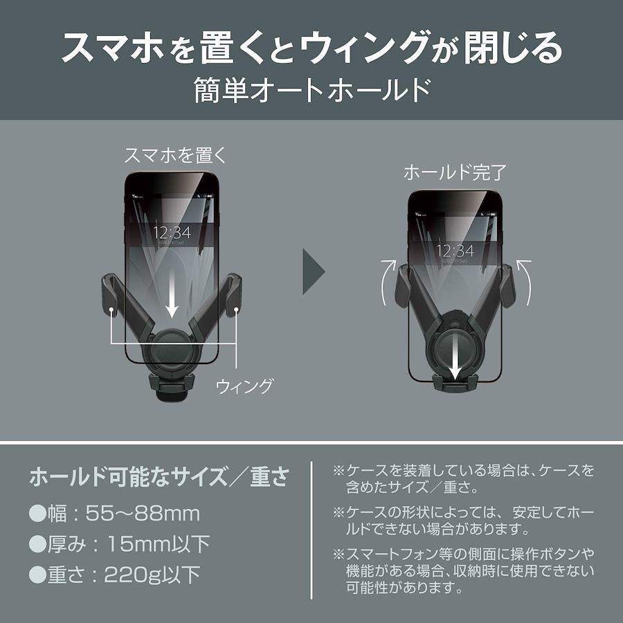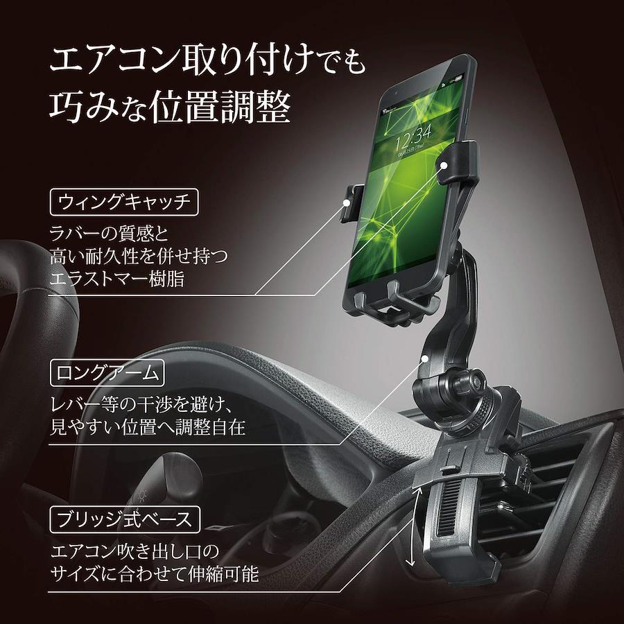 スマートフォンの重さに連動して左右のウィングが連動して閉じる構造を採用、手間なく片手で簡単にホールドすることができます。スマートフォンを持ち出すときは、スマートフォンを持ち上げるだけでウィングが自動的に開き、簡単に取り出すことができます。ラバーの質感と高い耐久性を併せ持つエラストマー樹脂を採用しています。またスマートフォンを支える下部のフックには、緩衝性に優れるソフトクッションを採用、走行中でもカタ付かず、スマートフォンにキズをつけることもありません。ロングアーム+ボールジョイント+2モーションジョイントで、スマートフォンの位置調整が自由自在。レバー等の干渉を避けて、見やすい場所に位置することができます。締め付け式のエアコンクリップでエアコンフィンにしっかりと取り付けることができます。ベース部分はブリッジ式を採用、エアコン吹出し口のサイズに合わせて伸縮ができ、より多く大きさのエアコンに取り付けが可能です。ホールド可能なサイズと重さは幅:55~88mm/厚み:15mm以下/重さ:220g以下。様々なスマートフォンに対応します。ケースや落下防止リングを付けていても、ホール