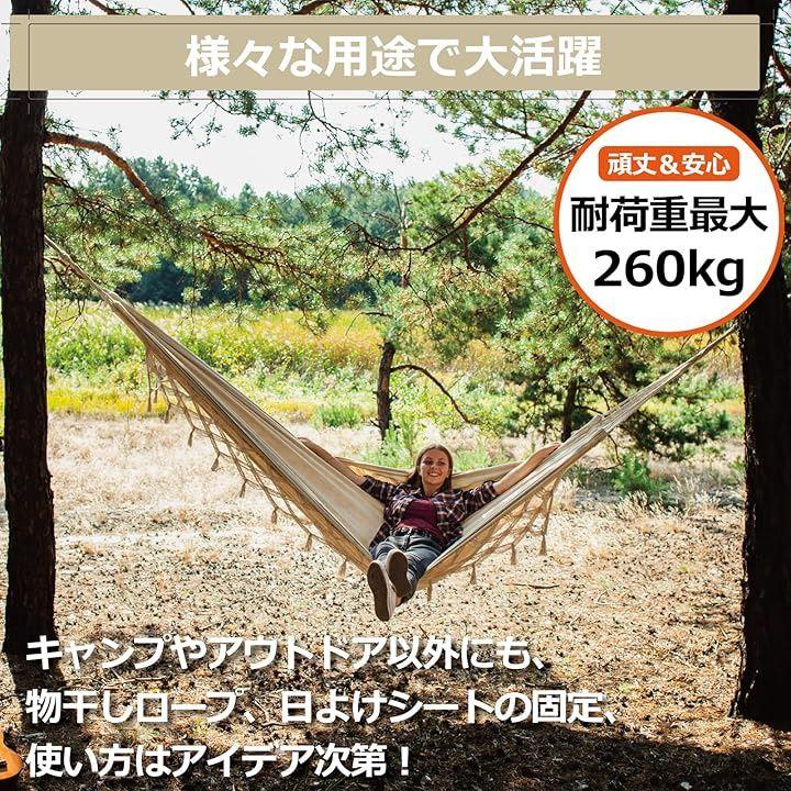 「頑丈&安心の耐荷重設計(260kg)」耐荷重最大260kgの高強度仕様で、タープやテントの設営はもちろん、ハンモックや荷物の固定にも安心して使用できます。