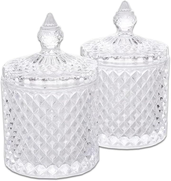 「商品内容」ガラス製小物入れ セット数:2個 カラー:クリア/アンバー/ブルーグレー 素材:ガラス サイズ:直径/約8.5cm 全高/約14cm 高さ/約8.1cm(蓋を含まない) 容量/約300ml 重さ/約450g