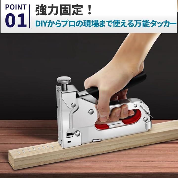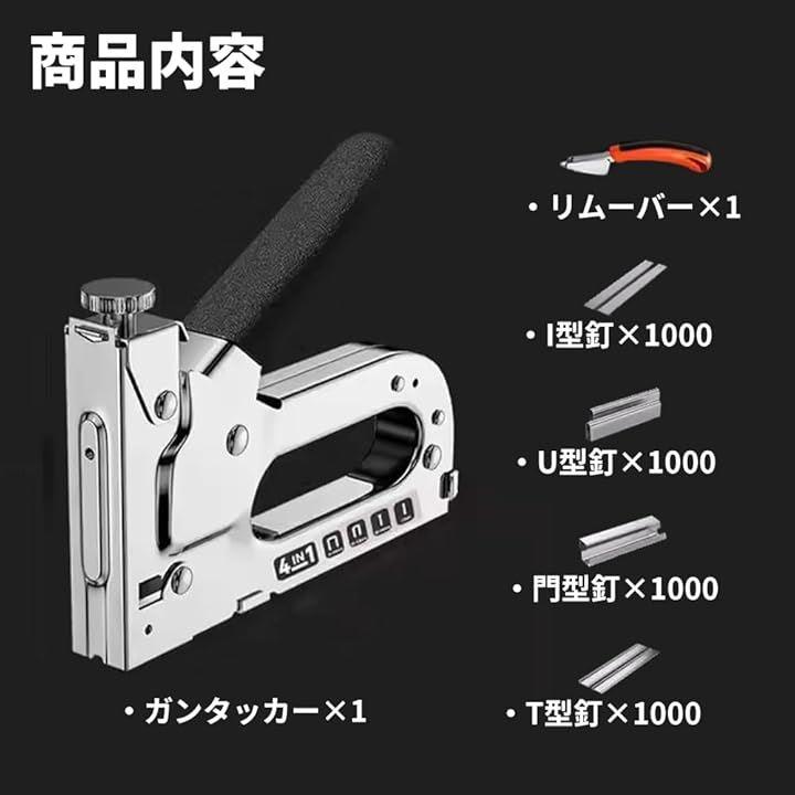 「すぐに使える充実セット」ガンタッカー本体に加えて、4種の針(I型・U型・門型・T型)を各1000本ずつ、さらにリムーバーも付属。