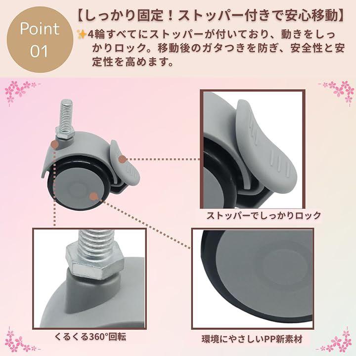 「しっかり固定。ストッパー付きで安心移動」4輪すべてにストッパーが付いており、動きをしっかりロック。