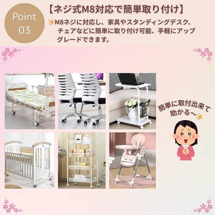 「ネジ式M8対応で簡単取り付け」M8ネジに対応し、家具やスタンディングデスク、チェアなどに簡単に取り付け可能。