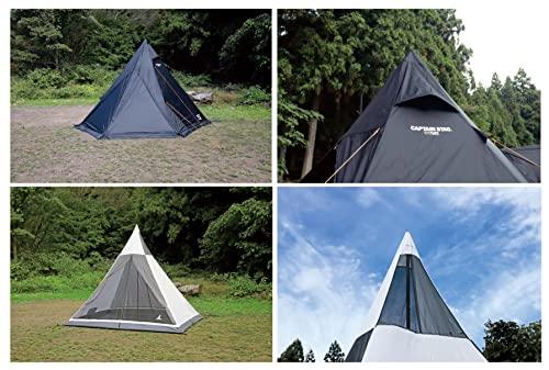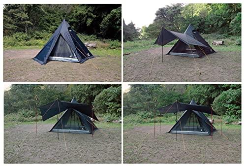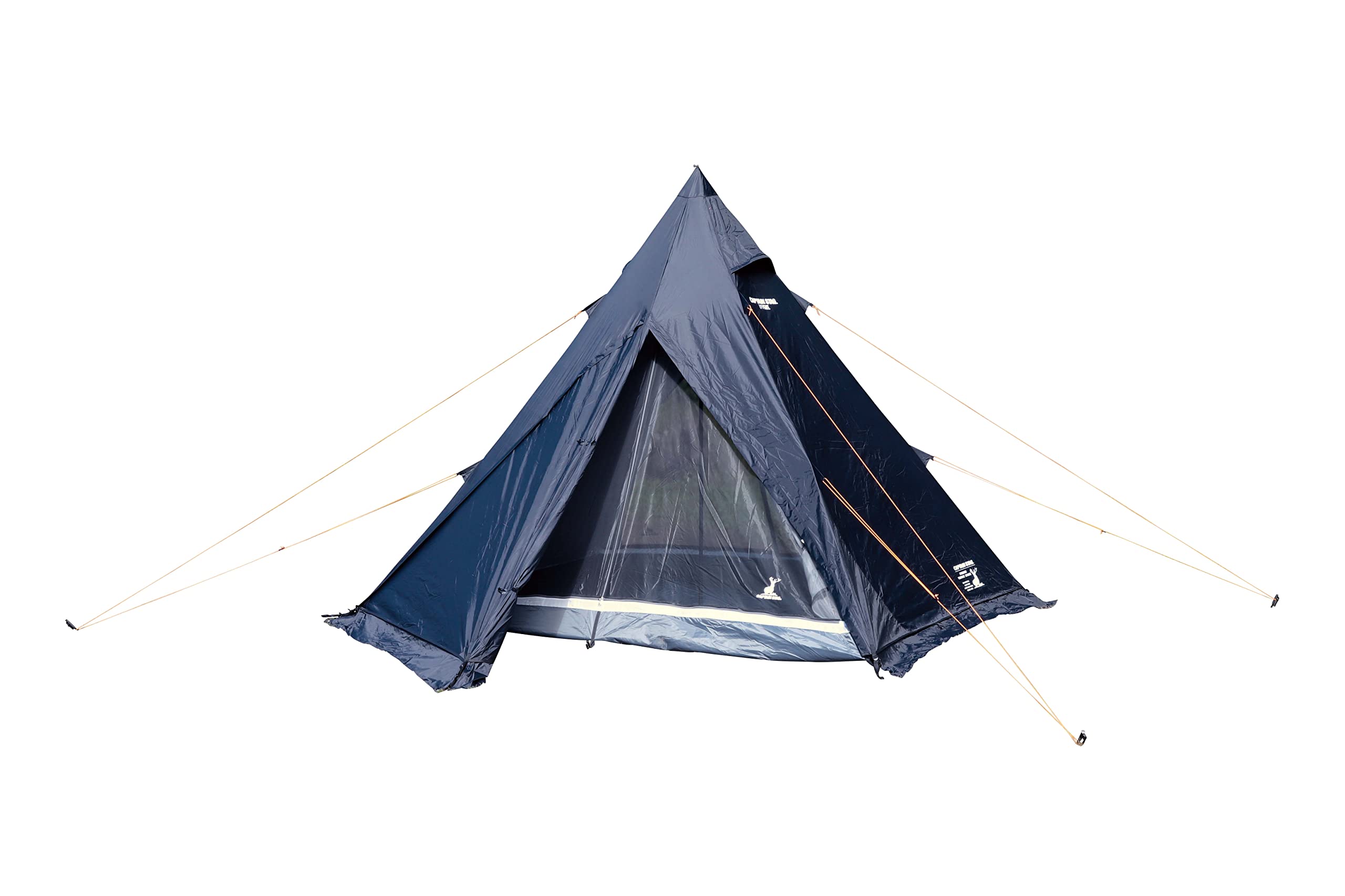 快適装備をプラスしたティピー型ワンポールテント!■前面に大型キャノピー、袖にスカート、後面に出入口兼用の荷物室を装備。■インナーテントは使いやすいスクエア(四角形)タイプの4人用。■テント内を換気する快適装備。・左右に開閉可能なベンチレーションを装備。・インナーテント天井のメッシュでテント内を換気。
