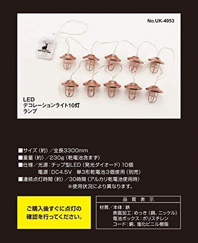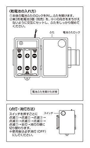 製品サイズ:(約)3300mm仕様:光源/チップ型LED(発光ダイオード)10個、電源/DC4.5V 単3形乾電池3個使用(別売り)連続点灯時間:(約)6時間(アルカリ乾電池使用時)※消し忘れ防止のため、約6時間で自動消灯します。点灯時間:(約)30時間(アルカリ乾電池使用時)※使用状況により異なります。材質:本体/鉄、表面加工/めっき(銅・ニッケル)、電池ボックス/ポリスチレン、コード/銅・塩化ビニル原産国:中国