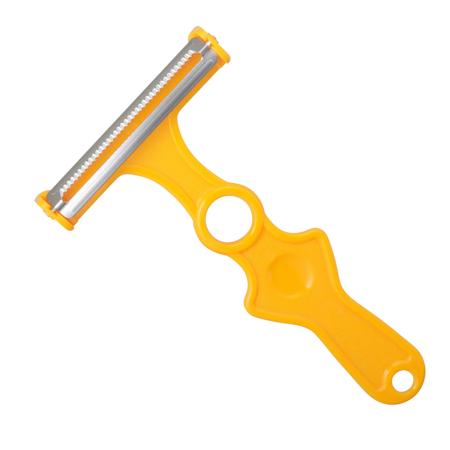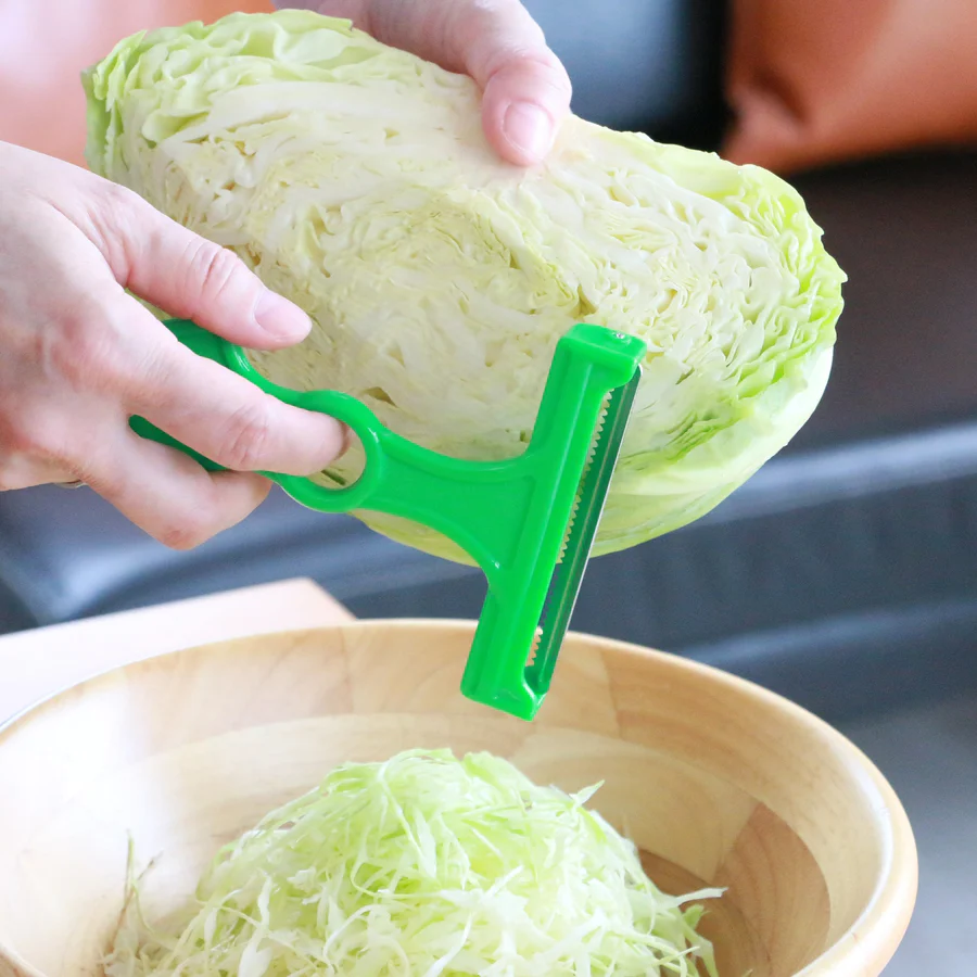 面倒だったキャベツの千切りは、ピーラーで簡単に作れる時代に。しかし、ピーラーを引く際にキャベツの飛び散りが気になるというお客様の声を頻繁に耳にしました。千切りキャベツが飛び散ると後片付けが大変ですし、もったいない。この課題を解決したいという想いで開発したのが、「ののじ キャベツピーラー スーパーライト」です。切れ味にこだわったオリジナル三角刃を搭載し、キャベツの飛び散りを抑制。軽い引き心地で、とんかつ屋さんで出てくるようなエアリーな食感の千切りに仕上がります。22gで超軽量、指1本で簡単に引けるので、手の握力が弱まっているご年配の方にも難なくお使いいただけます。ふわふわで均一な極細千切りキャベツを、ご家庭で手軽かつスピーディに作れるピーラーです。