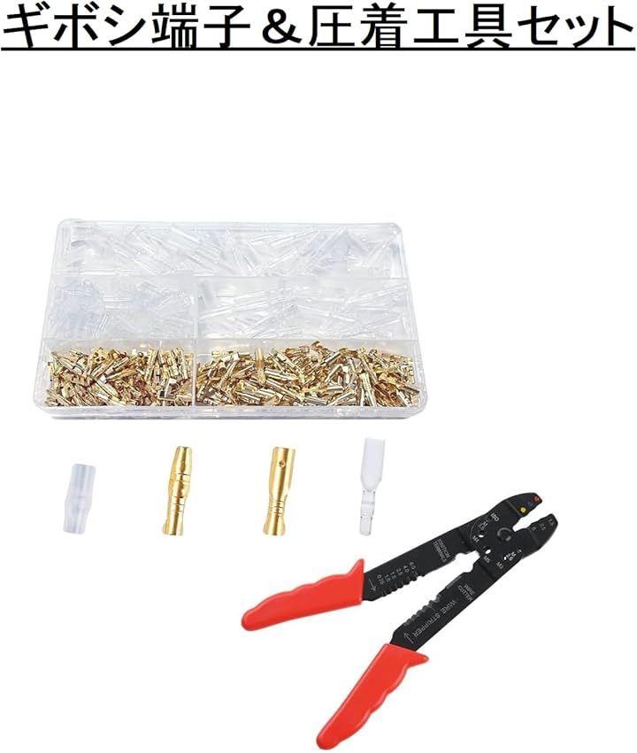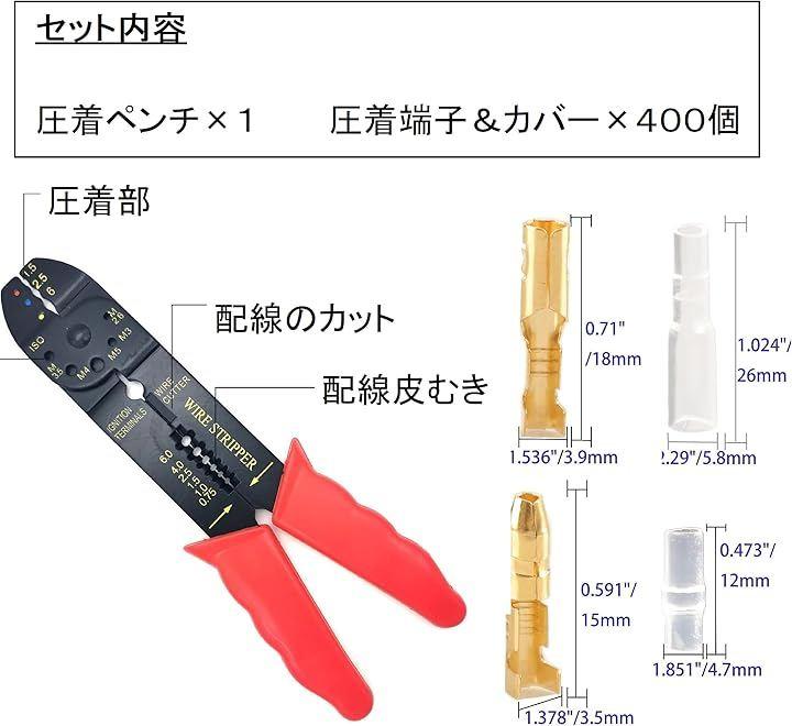 「商品詳細」圧着ペンチx1 ギボシ端子セットx1 BOXサイズ:17.5x10x2.3cm 重量:133g 対応機械:車やバイク、トラクター、農機具などの12V、24V用です。