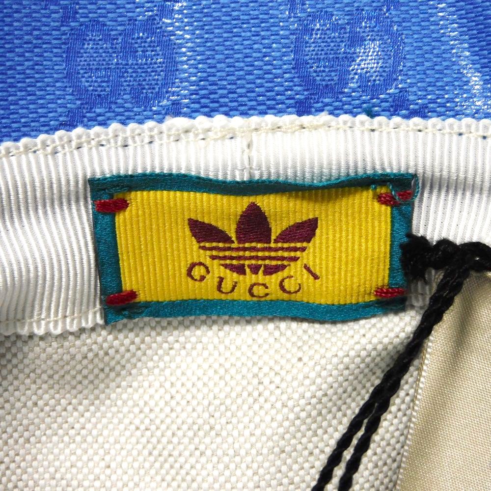 | ビニールコーティングが施された、グッチのGGパターンにアディダスのトレフォイルロゴがエンボス加工された「GG クリスタル ワイド バケット ハット」帽子です。 |