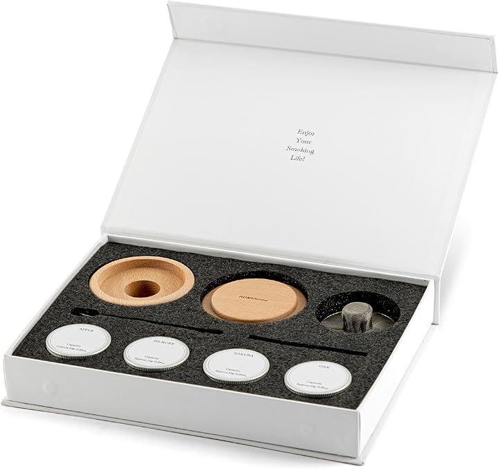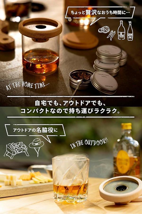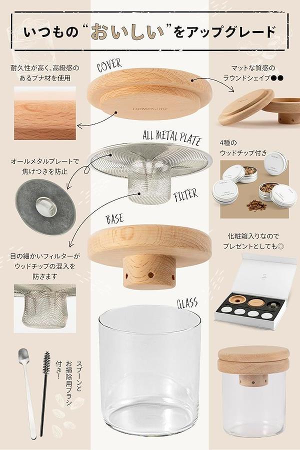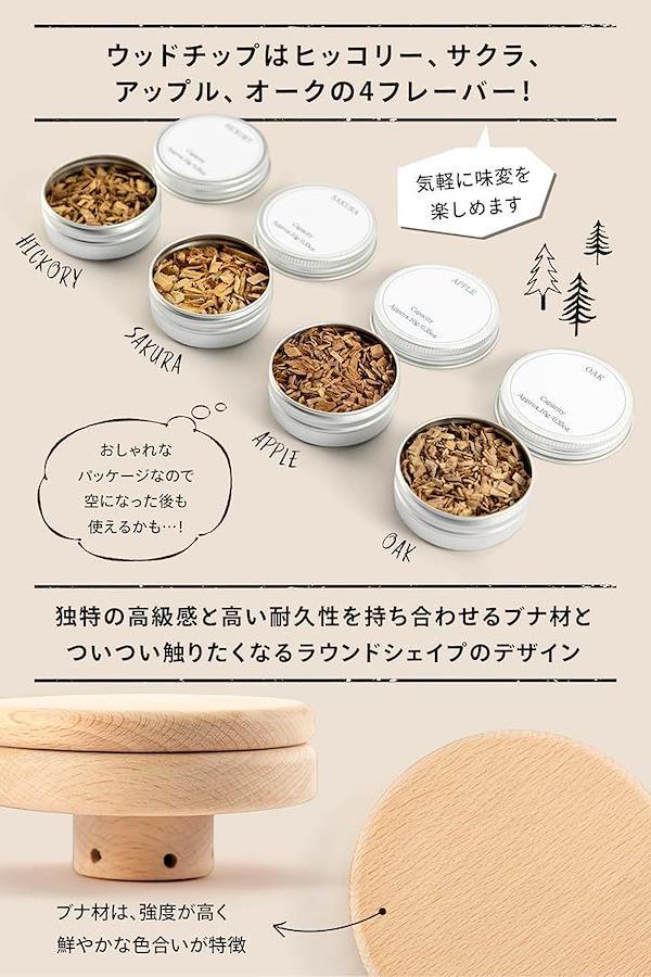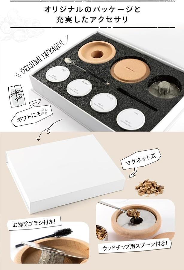 高級感のあるチップ用のスプーン、フィルター掃除用のブラシ、おしゃれなパッケージデザインのウッドチップはサクラ、オーク、ヒッコリー、アップルの4種のフレーバーです。