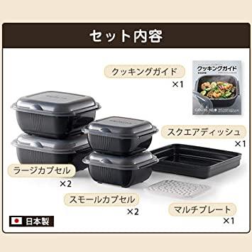 商品内容:ラージカプセル×2個、スモールカプセル×2個、スクエアディッシュ×1個、マルチプレート×1個、クッキングガイド×1冊ラージカプセル (外形寸法/重さ/容量):幅18.8×奥行16.7×高さ8.9cm/161g/1,320mlスモールカプセル (外形寸法/重さ/容量):幅15.6×奥行13.7×高さ7.2cm/107g/670mlスクエアディッシュ (外形寸法/重さ/容量):幅19.9×奥行18×高さ3.2cm/118g/900ml、マルチプレート (外形寸法/重さ):幅13×奥行12×高さ1cm/22g素材:[容器の本体/スクエアディッシュ/マルチプレート] シンジオタクチックポリスチレン・[容器のフタ] ポリプロピレン、耐熱温度:[本体] 230℃・[フタ] 150℃