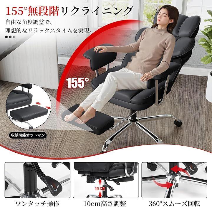 「155°リクライニング&寝違え防止」最大155°の大角度リクライニングで、仕事から休息へとシームレスに移行。