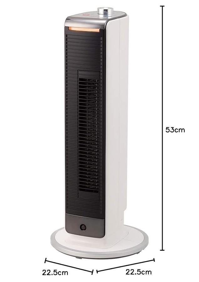 【仕様】・消費電力:温風800/750W(50/60Hz)、送風30W ・電力切換スイッチ:温風W数切換ボタン ・コード長:約1.8m ・二重安全転倒スイッチ:○ ・人感センサー:○ ・送風機能:○ ・送風時風量切換:弱・中・強 ・タイマー:1/2/3時間 ・自動オフタイマー:5時間(温風時のみ) ・本体サイズ:約225(W)×225(D)×530(H)mm ・本体質量:約2.9kg
