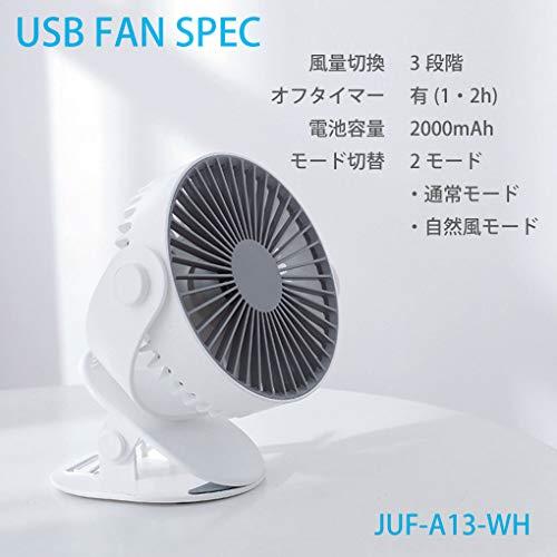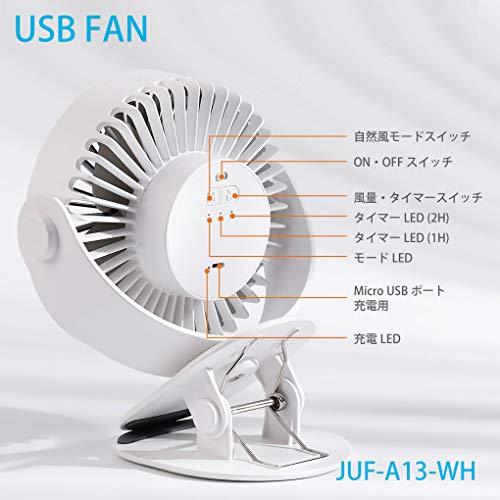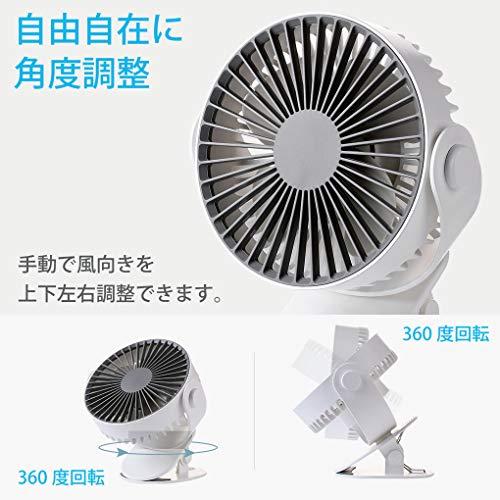【卓上&クリップ&吊下げ&壁掛け出来ます】クリップ式で様々なところに挟んで使用することが出来ます。クリップの底面部には、台座として使えるように滑り止めが付いており、卓上に置いても使用が可能です。本体底面に吊り下げ用フックがあり、テント内に吊り下げて使用することが出来ます。壁掛け用フック穴が本体底面に設置してあり、壁に掛けて使用することも可能です。【自然風モード&360度回転&風量3段階調節】自然風モードスイッチが付いており、ユーザー様に寄り添った気持のいい自然な風をお届けすることができます。手動で左右、上下を360度調整が可能、様々な角度から気持ち良い涼しい風が吹きます。風力は3段階で切り替え可能です。使用時はお好みに合わせて自由に風量を調節できます。【OFFタイマー付き】1時間、2時間設定可能なOFFタイマーが付いておりますので、就寝時など寒すぎず、暑すぎず、また、省エネになります。【コンセントがなくても大丈夫です】2000mAhバッテリー内蔵しているため、約6時間(低速モード)使用可能です。コンセントがない場所でも、事前に充電しておけば、安心です。充電時間も約3時間と