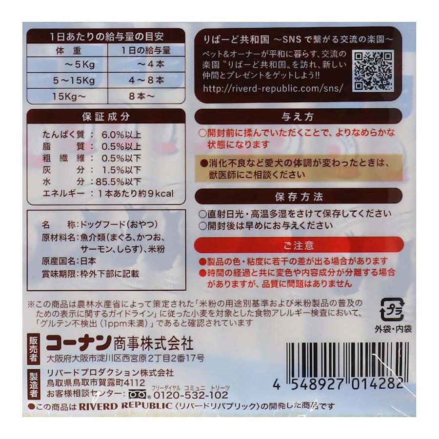 【仕様】●原材料名【牛もも】鶏砂肝、牛もも肉、米粉【緑黄色野菜ミックス】鶏ささみ、野菜類(にんじん、かぼちゃ、ブロッコリー)、米粉【海鮮ミックス】魚介類(まぐろ、かつお、サーモン、しらす)、米粉【鶏ささみ】鶏ささみ、米粉●保証成分【牛もも】たんぱく質6.0%以上、脂質0.0%以上、粗繊維0.5%以下、灰分0.5%以下、水分83.5%以下エネルギー:1本あたり約10kcal【緑黄色野菜】たんぱく質5.0%以上、脂質0.0%以上、粗繊維0.5%以下、灰分1.0%以下、水分86.5%以下エネルギー:1本あたり約8kcal【海鮮ミックス】たんぱく質6.0%以上、脂質0.5%以上、粗繊維0.5%以下、灰分1.5%以下、水分85.5%以下エネルギー:1本あたり約9kcal【鶏ささみ】たんぱく質7.0%以上、脂質0.0%以上、粗繊維0.5%以下、灰分1.0%以下、水分84.5%以下エネルギー:1本あたり約9kcal●原産国:日本●賞味期限:商品の裏面の下部分に記載●1日あたりの給与量:体重0~5kg 1~4本、5~15kg 4~8本、15kg以上 8本~●与え方:開封前に揉んでいただくことで、よりなめらかな状態になります。