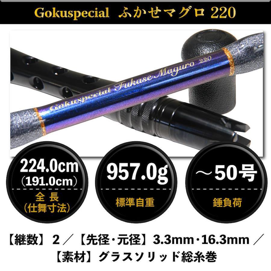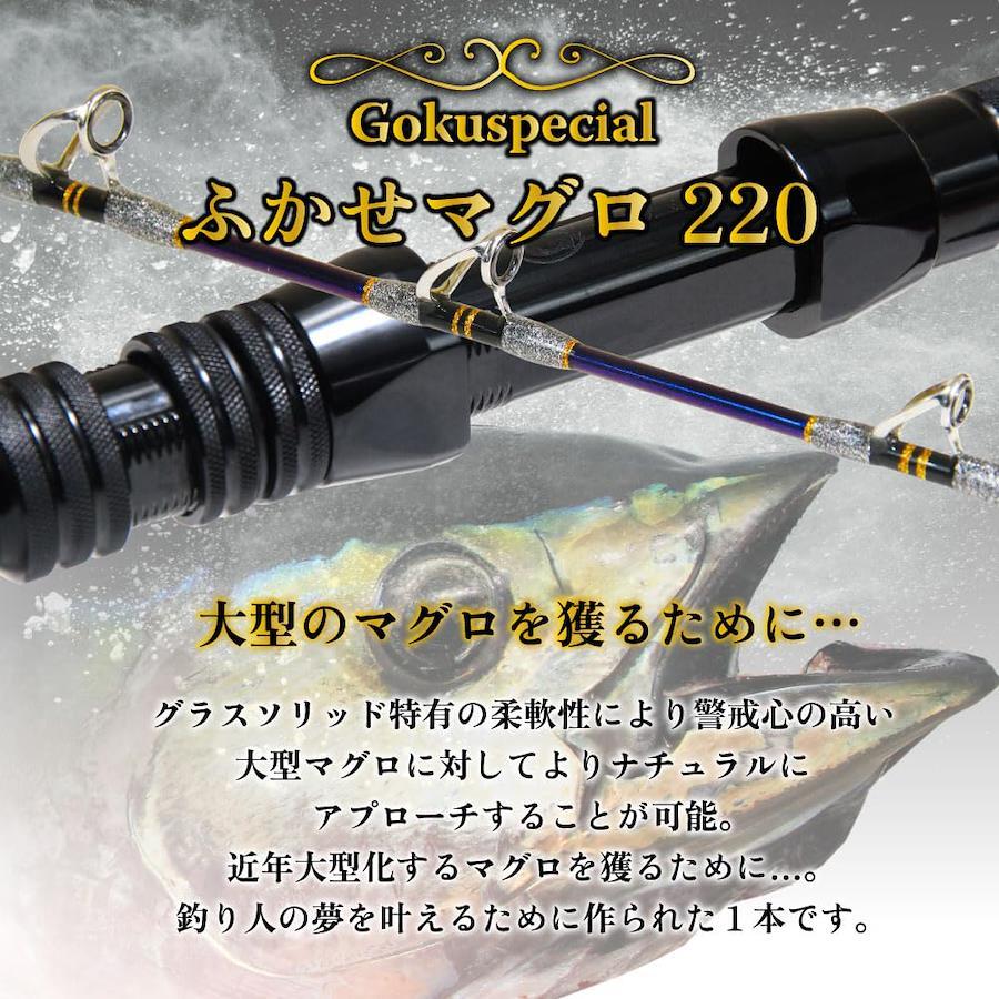 大人気のフカセ釣りによるマグロ狙いのために開発された1本。大型マグロを獲るためにレングスを長めの220cmに設定し、マグロの引きを竿全体で受け止める仕様になっています。さらにグラスソリッド特有の柔軟性により警戒心の高い大型マグロに対してよりナチュラルにアプローチすることができます。まさに近年大型化するマグロを獲るために…、釣り人の夢を叶えるために作られた1本です。
