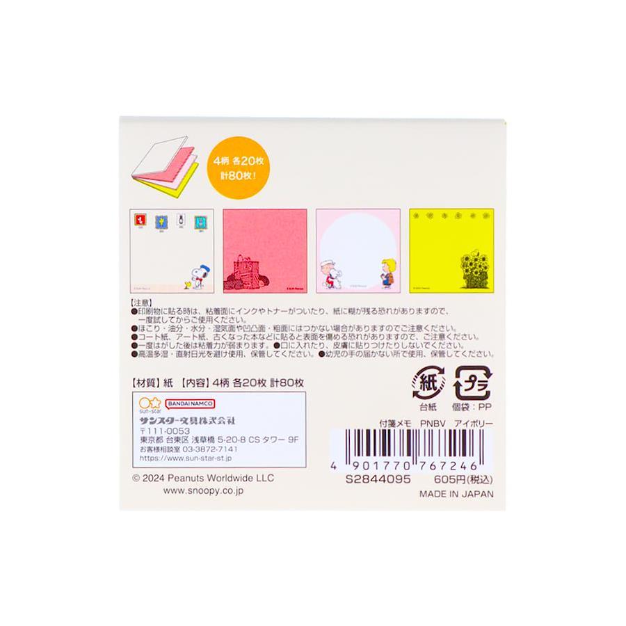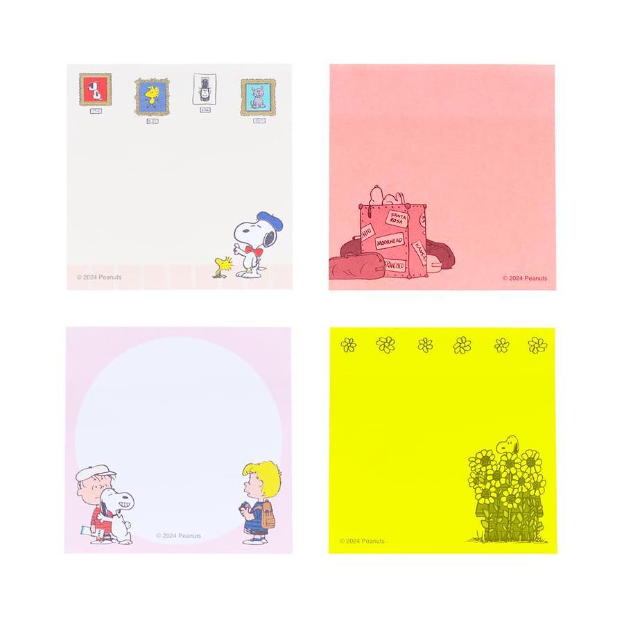 スヌーピーの[トラベル]柄グッズ!付箋メモ4種類あるデザインの好きな柄から使える大人気のブロック型の付箋です。鮮やかな蛍光色やシンプルで使いやすいパステルカラーなど4種類の柄が1冊になったブロック付箋です。正方形でちょっとしたメッセージなどに使いやすい大きさです。