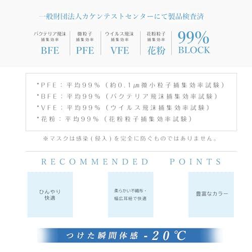 カットフィルターを使用した不織布マスクです。不織布の間にメルトブロウン層を挟み、BFE(微粒子ろ過効率)99.9%を実現しました。顔にフィットし、小顔効果も抜群です。さまざまな色の展開で、マスクをおしゃれに着用できます。