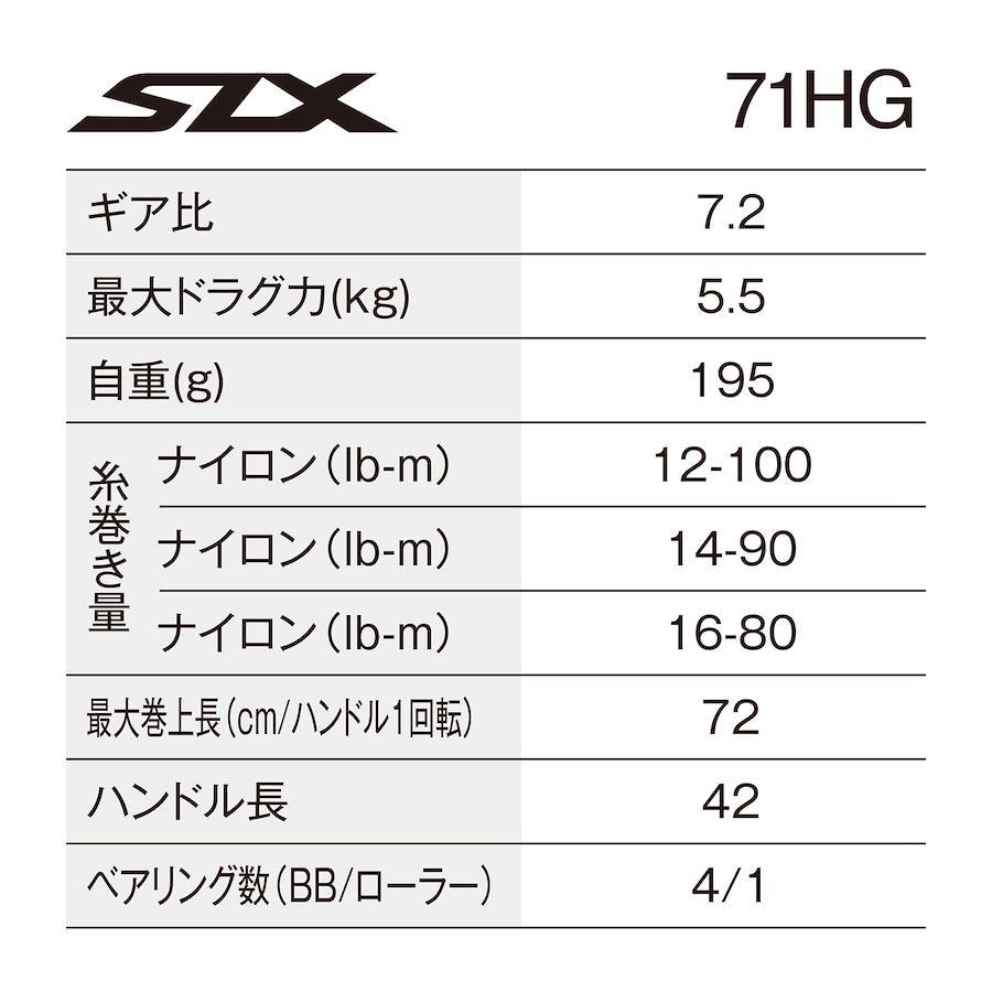 ギア比:7.2最大ドラグ力(kg):5.5自重(g):195.0スプール 径/幅(mm):32/21糸巻量ナイロン(lb-m):12-100、14-90、16-80、20-65