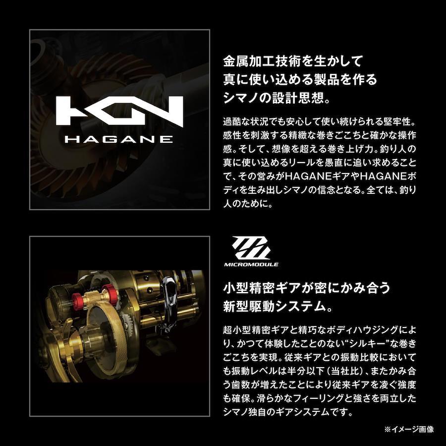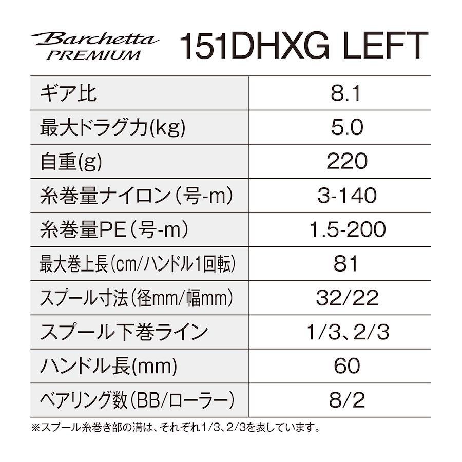シマノ(SHIMANO) 両軸リール 24 バルケッタ プレミアム !!快適に巻き、意のままにフォールを演出。マイクロモジュールギア搭載、HAGANEボディとX-SHIPにより滑らかな巻きごこちと剛性を備えるカウンター付軽量リール、バルケッタプレミアムが更なるアップデートを遂げて登場。ワンウェイローラーベアリング搭載でブレーキをかけてもハンドル回転が重くならないNEWフォールレバーを搭載、スローフォールの誘いが有効となるメタルスッテ、タチウオ、ヒラメ、一つテンヤ、鯛ラバ、SLJなどにおいて、巻きごこちをスポイルすることなく幅広く精密なフォールスピード調整を可能にします。視認性が向上したNEWラインカウンターに加え、設定距離ごとに音が鳴る巻き上げ距離アラームにより巻き始めからの距離を耳でも把握できるためティップから目を離すことなくタナを知ることが可能。ハンドルはシングルハンドル、ダブルハンドル共に60mmのロングハンドル仕様。CI4+素材などにより前モデルと比較して大幅な軽量化も達成しました。緻密にフォールをコントロール。いわゆるフォールのアタリや誘いは、メタルスッテゲームはもちろん、様々な釣りで重要とされるファクター。ターゲットによっては誘い上げと同等かそれ以上に重視されます。そのフォールスピードを自在に、かつハンドルの巻き心地にストレスを掛けることなく調整、再現することを可能にしたのがNEWフォールレバー。ワンウェイローラーベアリング搭載により、巻取り方向では回転が重くならない画期的な構造でフォールレバーを締め込んでもハンドルの巻きが重くならず、フォールスピードに左右されない安定したリーリングを実現。さらにレバー自体を幅広の形状に設計し、上面にはくぼみを持たせることによりレバーを上げた位置でも下げた位置でも指を掛けやすくなり操作性も向上。加えて視野角が広がり、巻上距離アラームなど新たな機能も加わったカウンターの搭載も相まって、フォールスピード、ヒットレンジの把握によるヒットパターンの再現性も高まっています。前モデルより30g以上の軽量化による、軽快な操作性。CI4+にアップデートしたサイドプレート部分を筆頭に、ディテールまで重量を見直すことにより、HAGANEボディでありながら全体で30g以上という大幅な軽量化(※)に成功しました。握り込みやすいロープロファイルのボディデザインと合わせ軽快な操作性をお届けします。※前モデルとの比較※こだわりの60mmロングハンドル。150、151には剛性に優れた冷間鍛造60mmパワーハンドルを、150DHXG、151DHXG、150DH、151DHには、シマノダブルハンドルモデル最長となる60mmロングダブルハンドルを標準装備。手のひらでしっかり握り込める大型ノブとの組み合わせでリーリングの安定感も向上し、長時間の釣りにもアングラーの疲労を軽減します。重めのメタルスッテやオモリを使用するシーンや大型の青物とのファイトでもパワー負けせず、安定した力強い巻き上げをサポートします。 巻上距離アラームで無駄のないアプローチをサポート。バルケッタ プレミアムに新たに搭載された巻上距離アラームはカウンターの水深表示に目をやることなく巻上距離を察知する新機能です。着底後に巻き始めた時点から計測を開始。設定距離の倍数で3回まで音が鳴り、カウンターを見ずとも音で巻上距離がわかります。例えば5m設定(A-5)の場合、底から15mまで5mごとに計3回の通知音が鳴り、釣り人に巻上距離を知らせます。この機能により船長の「底から○mで反応あり」「着底したら○m上げて」といった指示ダナに対してカウンターに目をやることなく聴覚による直感的な判断が可能となります。着底からの巻き上げ時、指示ダナへの集中力をこれまで以上に高めるための新たな機能です。糸巻き学習をより簡単に。糸巻き学習はスプール回転と糸巻量の関係をデジタルカウンターに記憶させ、この関係を用いて水深を表示させる機能です。従来モデルの学習機能に加えて、このサイズで使用頻度の高いPE 0.6/0.8/1.0/1.2/1.5号の学習データを搭載しました。下巻き量に関わらず、スプール外径から約1mmの位置まで指定糸が巻かれていれば、実用上十分な誤差範囲内で使用できます。※使用上の注意※指定糸学習はスプール最外径から約1mmの位置まで下巻きラインを含めて指定糸(シマノPEライン)を巻いた時の標準的な学習値になります。お客様の実際に巻かれる糸の種類やラインテンション、糸巻き後の外径によって精度が下がる場合があります。より確実に精度を求める場合はE1、E2、L1、L2モードにて学習してください。船のライトゲームを楽しみたい、全ての人におすすめしたいリールです。今回のモデルチェンジで進化した点の中で、まず実釣でその機能を体感、活用できるのがNEWフォールレバーです。フォールレバーはレバー操作により簡単にフォールスピードを調整できる機構なのですが、以前はそのブレーキがハンドルの巻きに影響してしまうため、例え