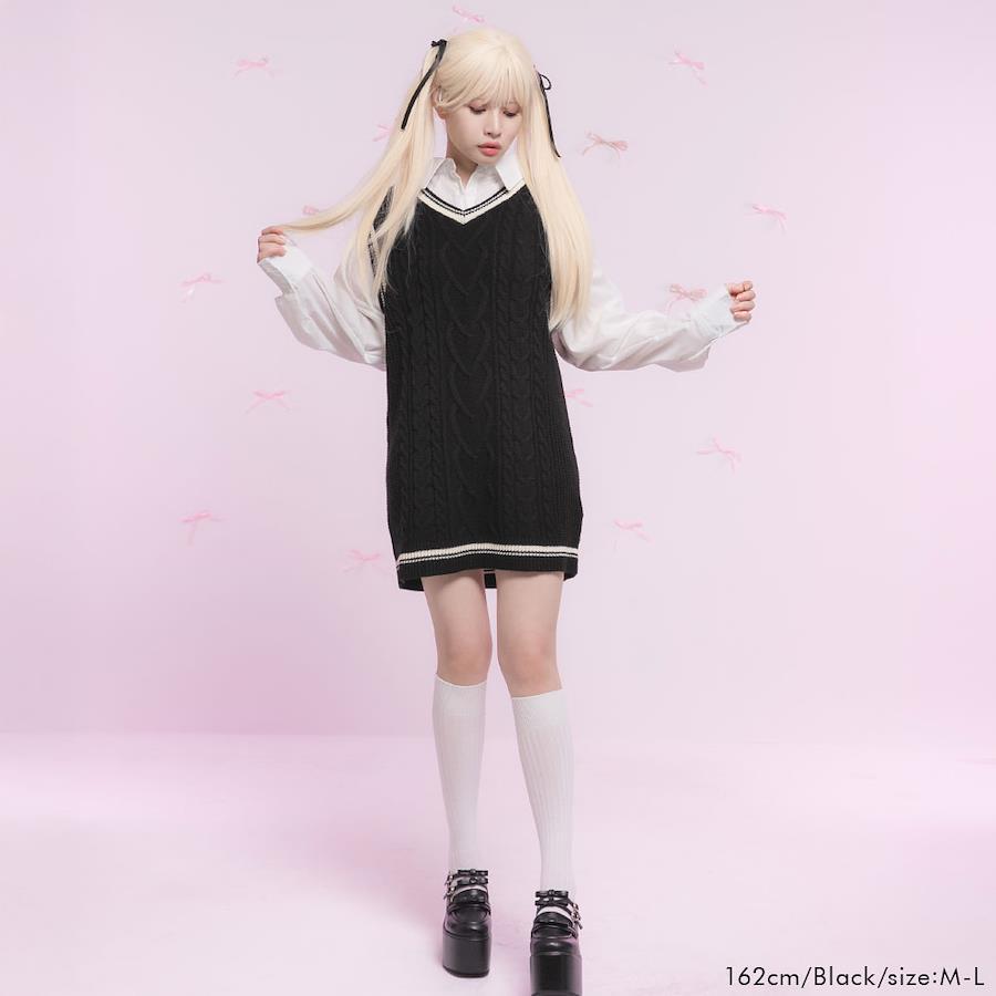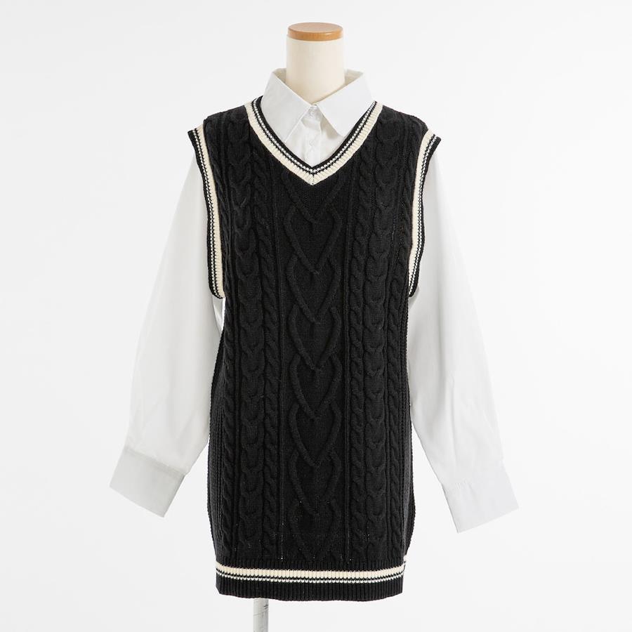 シャツとニットベストワンピのドッキングデザインワンピースのご紹介。【デザイン】トレンド感のあるプレッピーなデザインが可愛いレイヤード風ワンピース。ニット部分の立体的なハートケーブルがきゅんっとするデザインです♪袖はボリュームスリーブでゆるっとしたシルエットながら、ニット部分はIラインシルエットでスタイルアップしてくれます。シャツ襟の前立て釦を開けて、被りで着脱する仕様です。
